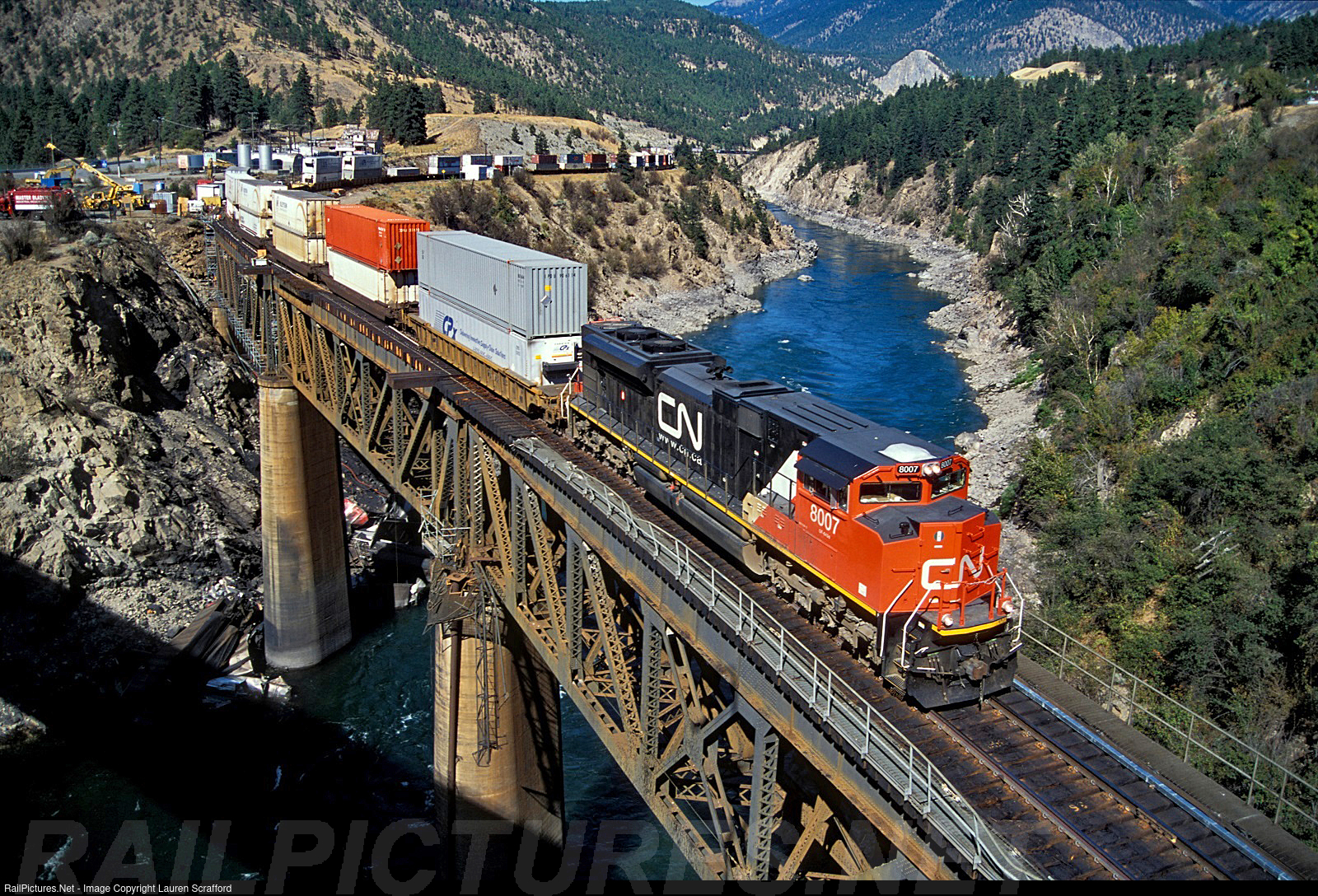 | Canadian National, CN 8007 with a W/B Intermodal crossing the Thompson River at Lytton, BC on August 31, 2006. The Thompson River flows into the Fraser River on the other side of this bridge. If you look below the bridge in this photo you will see some of the 7 Canadian Pacific loaded coal hoppers that took out part of the bridge railing and derailed into the Thompson River a few days before this photo. |