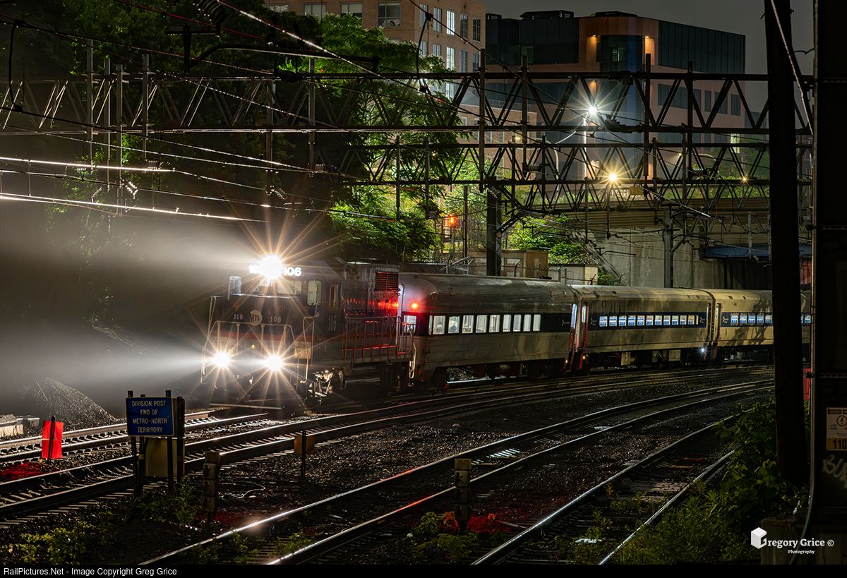 Just after midnight on June 10th, 2025, Metro-North Railroad’s Geometry/Track Inspection Train, led by EMD GP35r 106, sits at Division Post on the Shore Line section of Amtrak’s Northeast Corridor, just east of CP 274 at the eastern limits of the New Haven Line in New Haven, Connecticut. To inspect the interlocking, the train had to clear one train length onto Amtrak’s territory. This is a move that happens from time to time with Metro-North trains that need to switch tracks at CP 274.