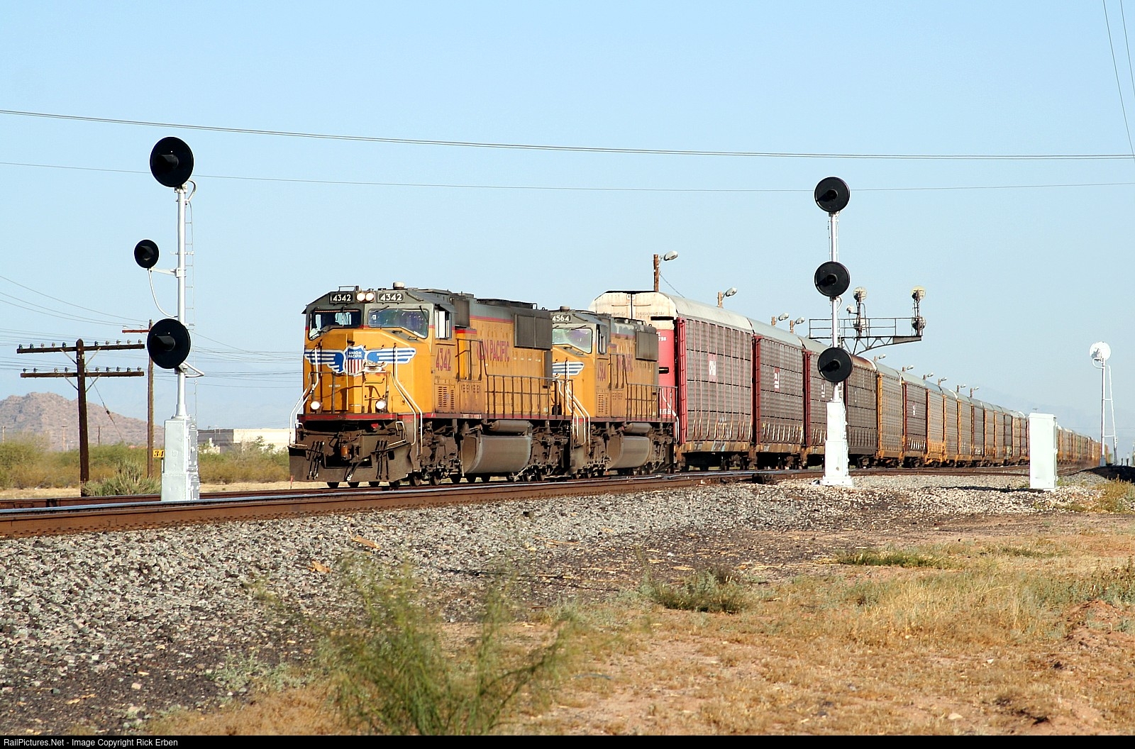 | An auto train led by two SD70Ms take a "right turn, Clyde" onto the Phoexnix Sub at Picacho, AZ. |