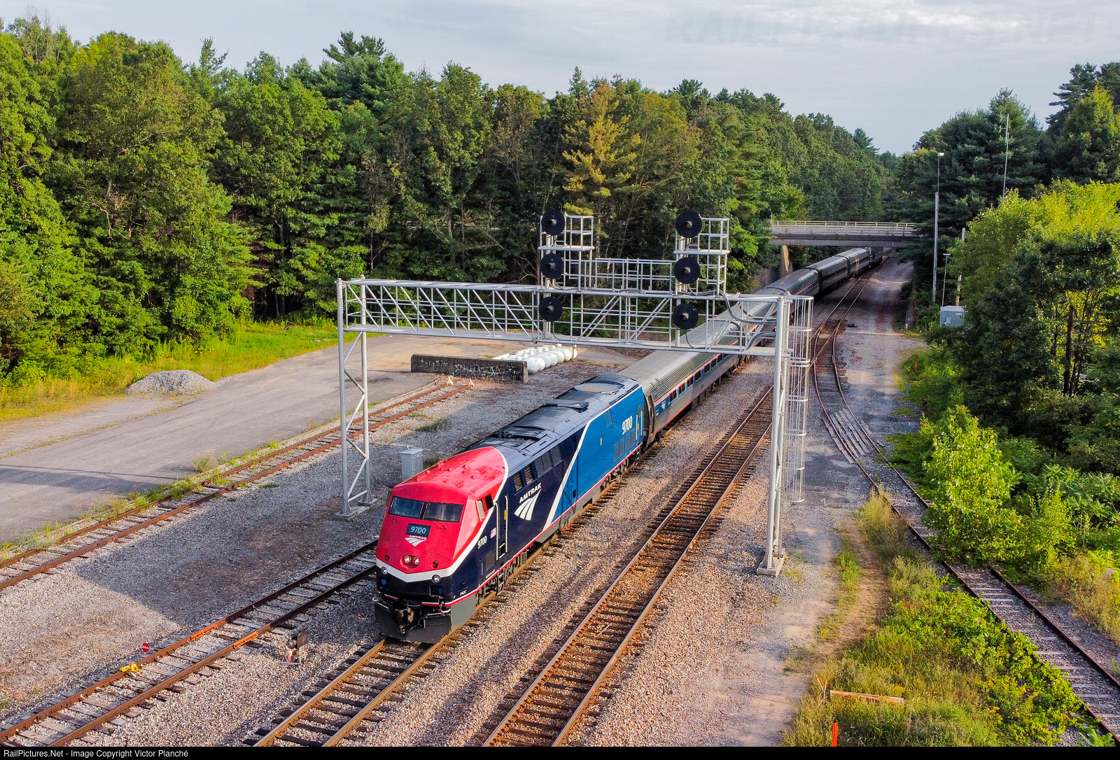 | Amtrak train 291 'Ethan Allen Express' from NYC to Burlington is approaching Saratoga Springs Station, with P42C 9700 leading the train. 9700 was born as AMTK 184 and is the first P42C "cab car" of the series, wearing the new livery. |