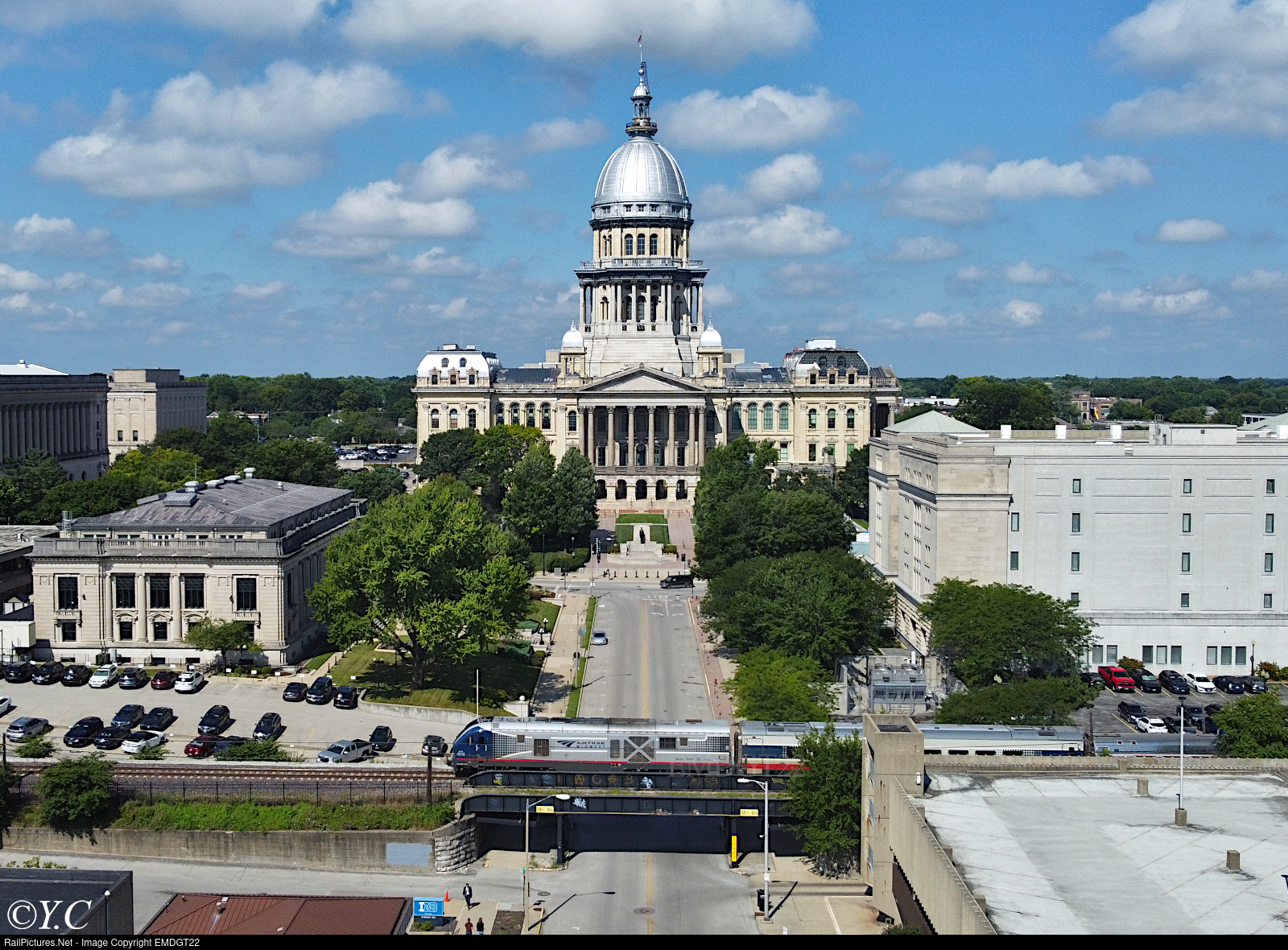 A southbound Lincoln Service train heads out of Springfield past the historic Illinois state capitol building.