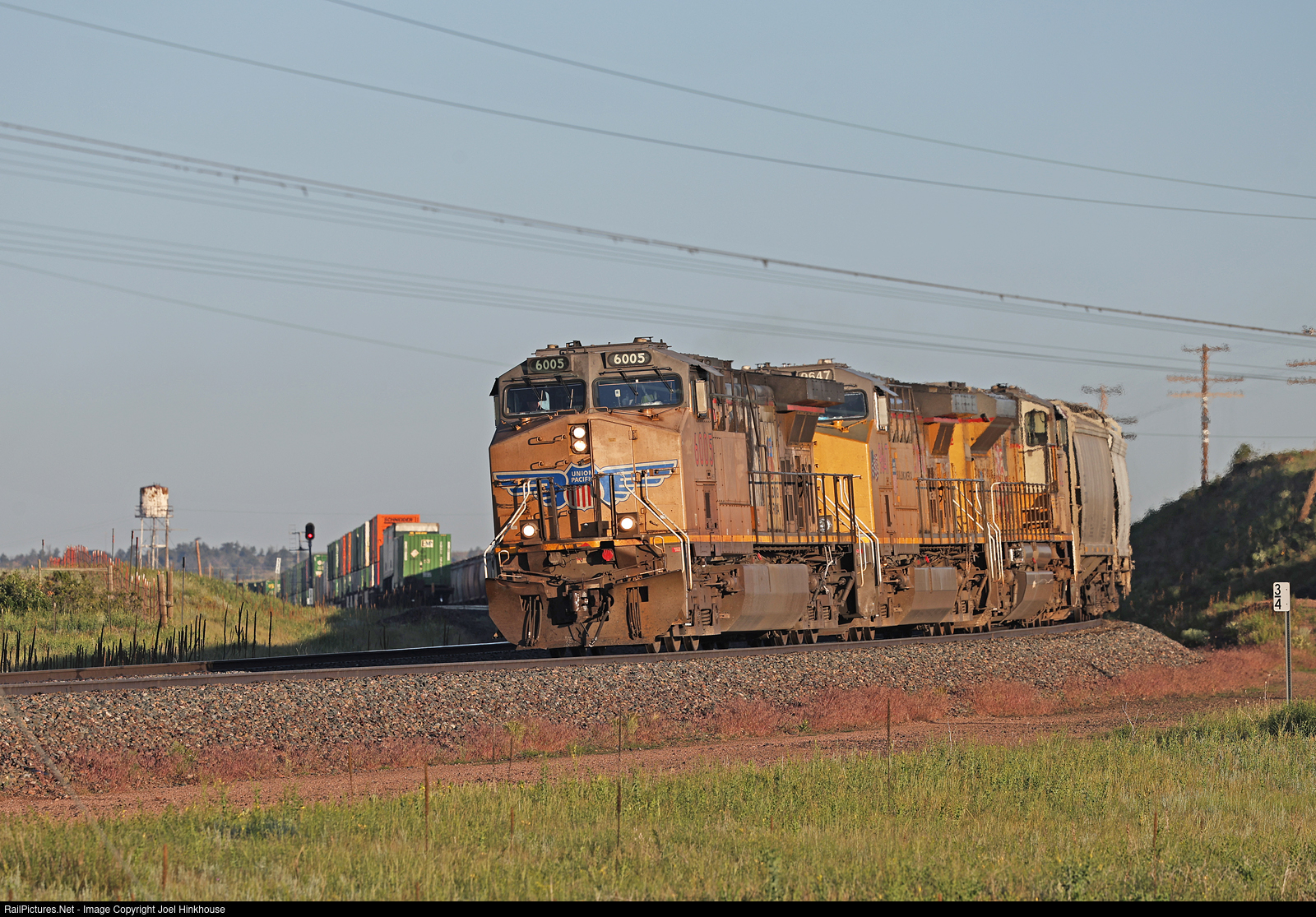 | Pass at Buford. Well it's not a Big Boy passing an FEF-3, but it will do! UP 6005 rolls confidently downhill, eastward toward Cheyenne. |