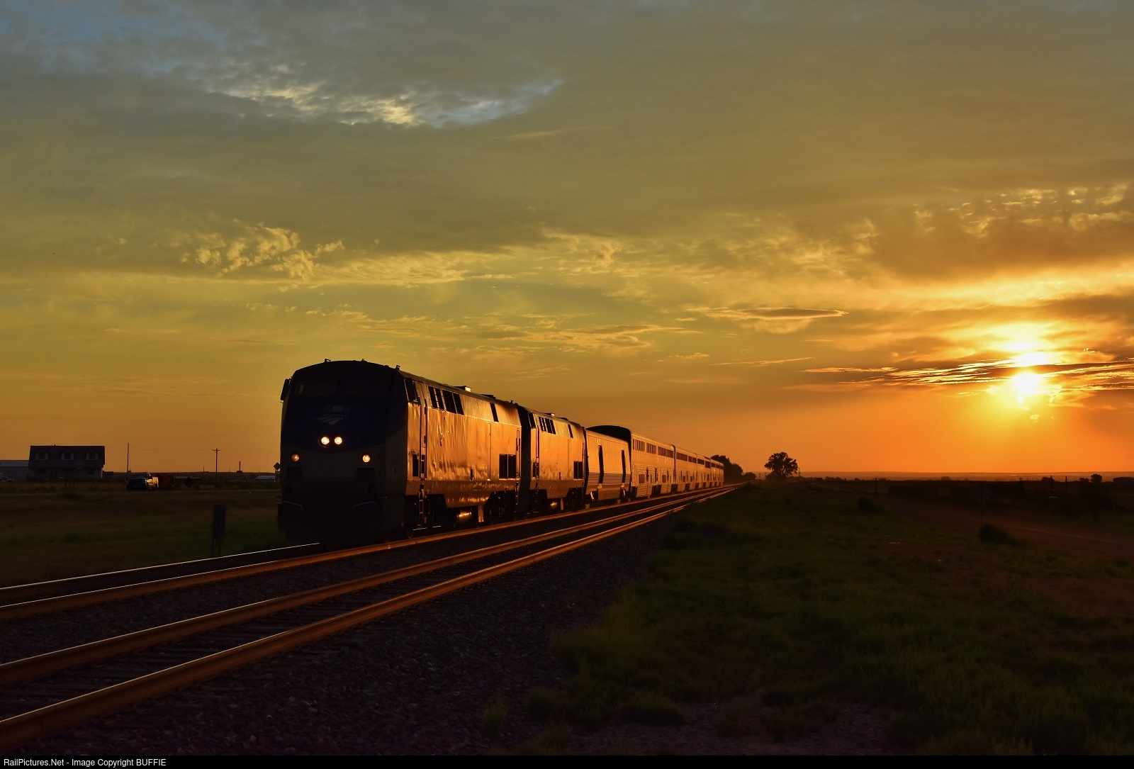 | The California Zephyr runs through Keenesburg, Colorado at sunrise. The red sky is due to the numerous wildfires that are burning on Colorado's western slope.