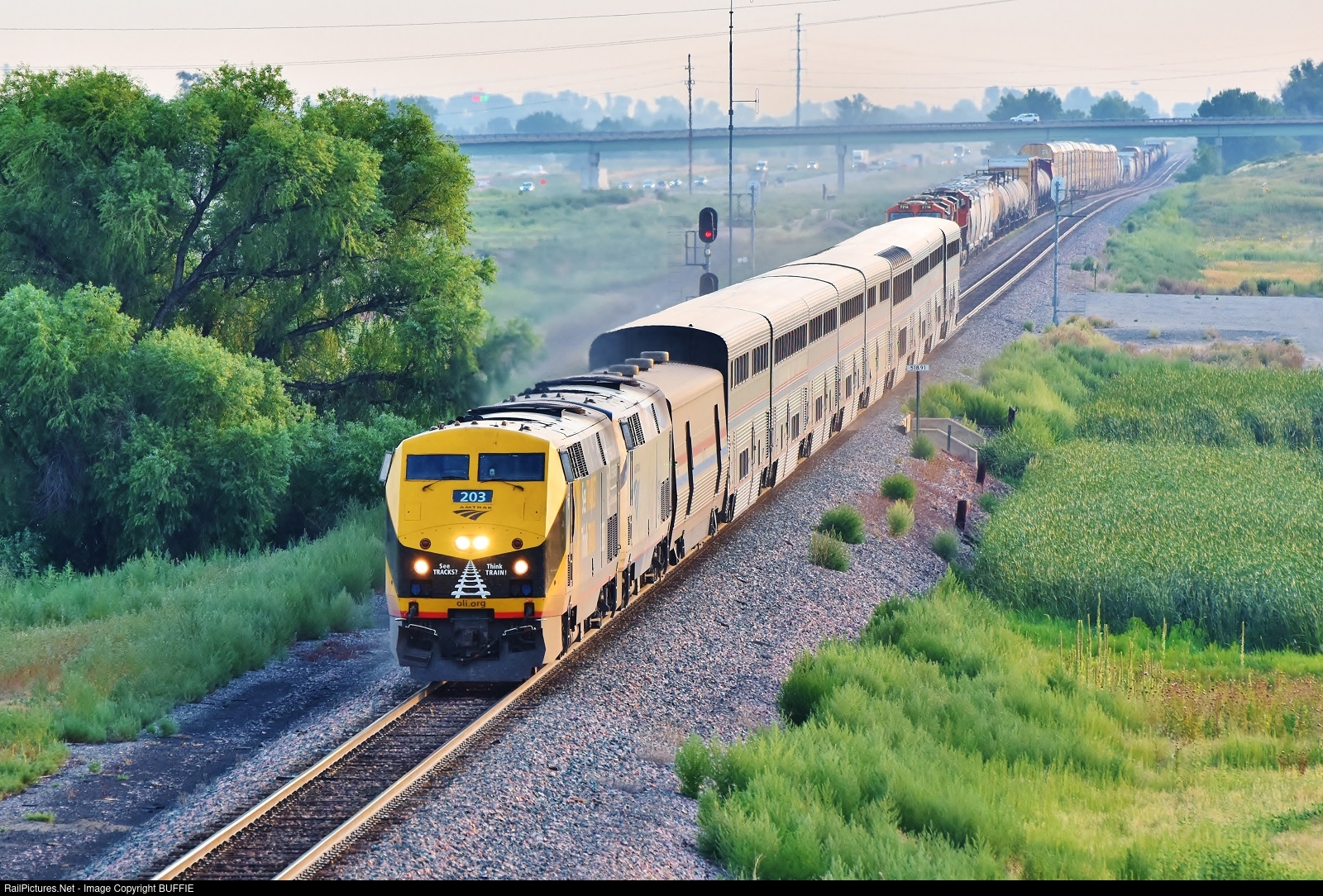 | Amtrak engine #203 (Operation Life Saver P42DC) runs through ground fog at Tonville, Colorado as it heads to Denver on the Brush Sub.