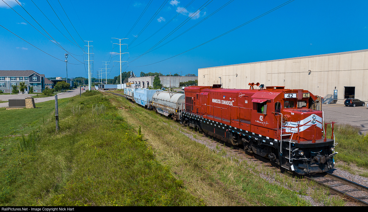 Minnesota Commercial #42 is in charge of three cars from the Commercial Transload plant in Fridley, MN. 42 is the only SF30B ever built.