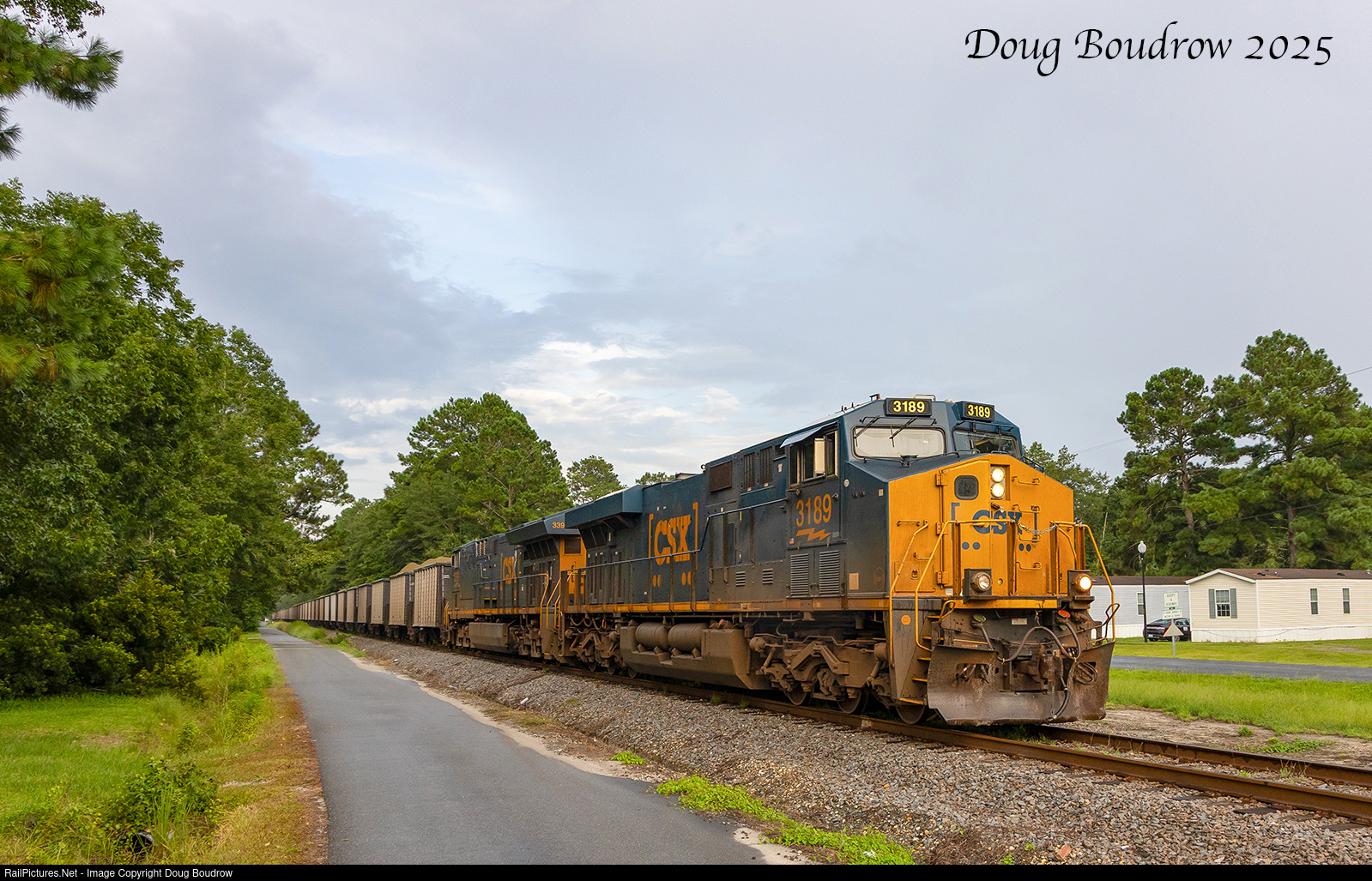 | On a hot, humid and stormy evening in Southern North Carolina, rock train B427 is headed toward Eastbrook in Leland running along Old Mill Road in Navassa. |