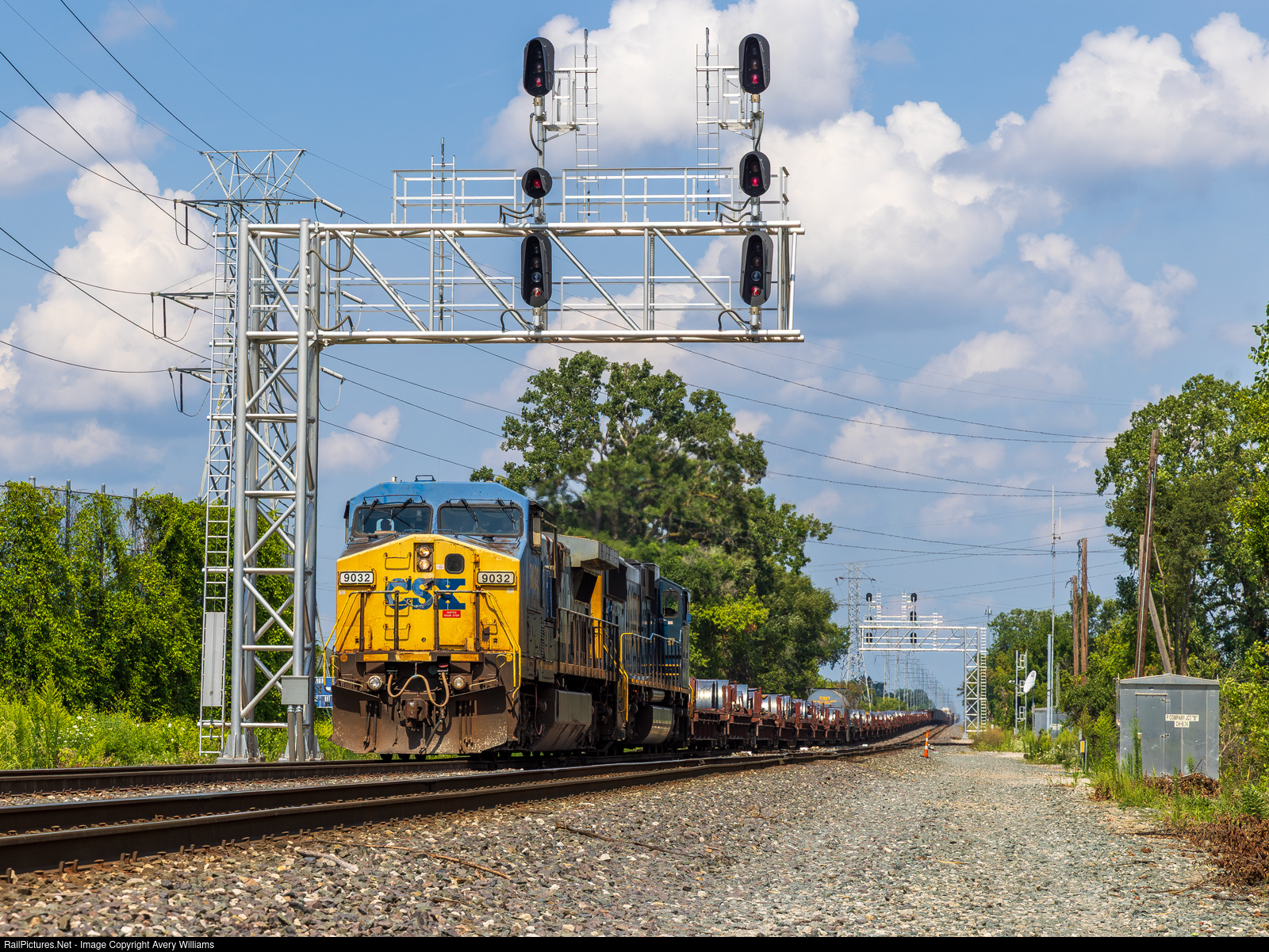 | CSXT 9032 leads CSX M510 from Cincinnati Queensgate yard yard to Detroit's Rougemere yard. Here they are going by past the signals at P Company in Dearborn just a few miles shy of there destination of Rougemere yard. |