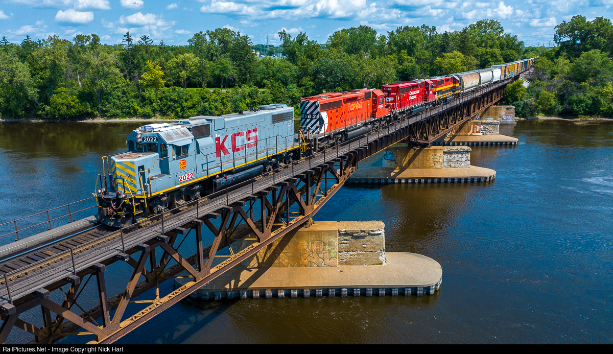 Shades Of The Milwaukee Road. Since the CPKC came to be, some pretty neat lash-ups have followed. KCS GP38-2 2022, CP SD40-2 6063, CP SD30ECO 5031 and KCS GP40-2 2971 lead J42 over the Mississippi River in the Camden neighborhood of Minneapolis. The leader, 2022, is unique in a couple ways as it still wears its KCS grey scheme. It's also the former Milwaukee Road 354, built in 1973. CP 6063 still wears its Pacman/multimark paint scheme, a scheme that is becoming a rarity to see on the active roster.