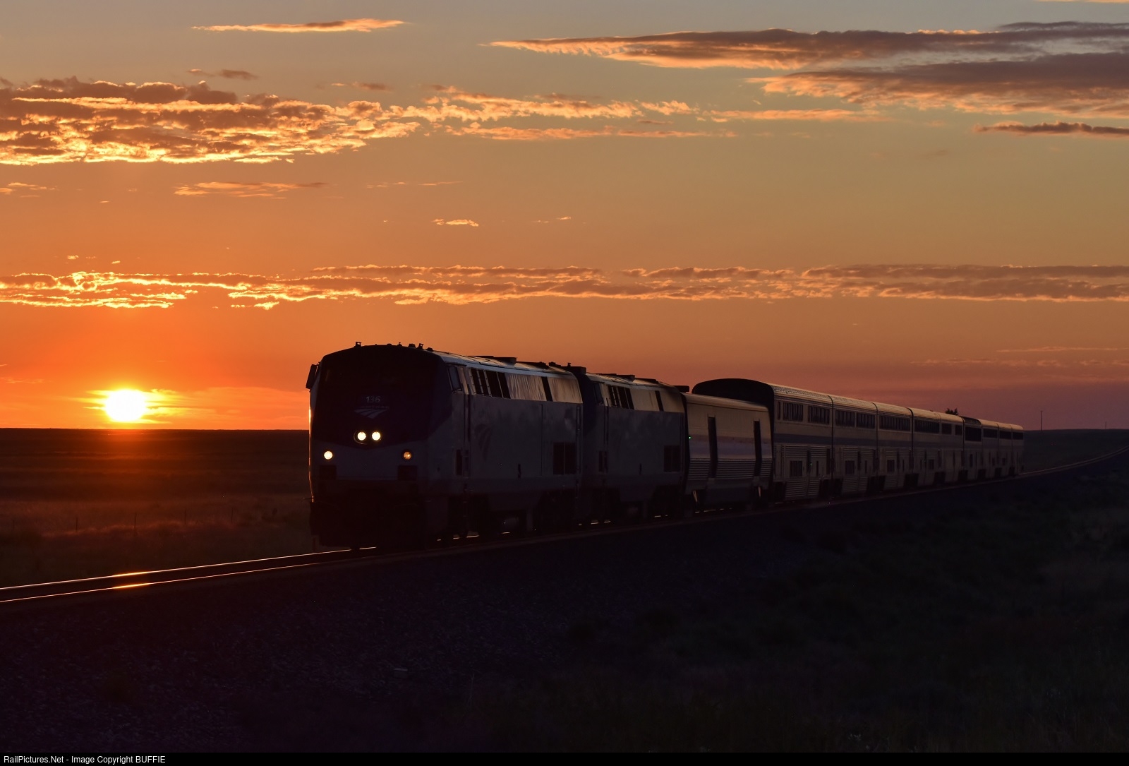 The California Zephyr runs through the crimson sunrise at Roggen, Colorado as it heads to Denver on the Brush Sub.