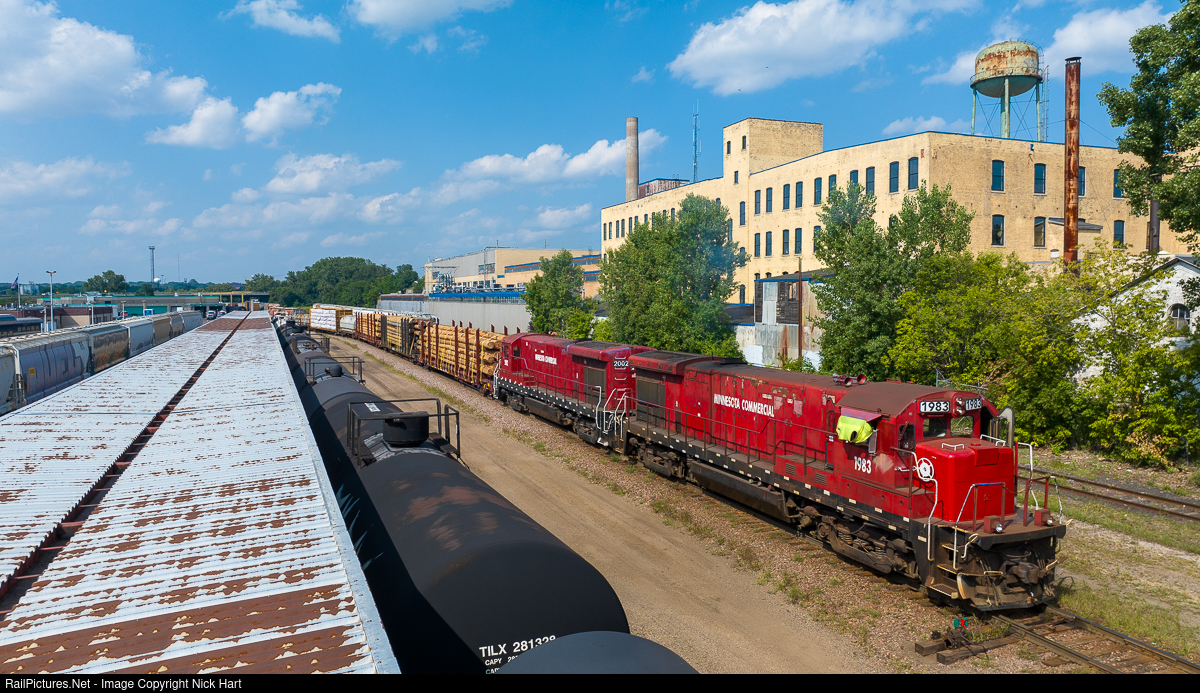 | On a muggy afternoon, MNNR 1983 and 2002 are hard at work, switching cars at their Midway Yard. During a headroom move, they pass the location that used to be the Saint Paul Amtrak Station. Both of these units are former Conrail B23-7's and were belching out quite a bit of smoke during their switching moves. |
