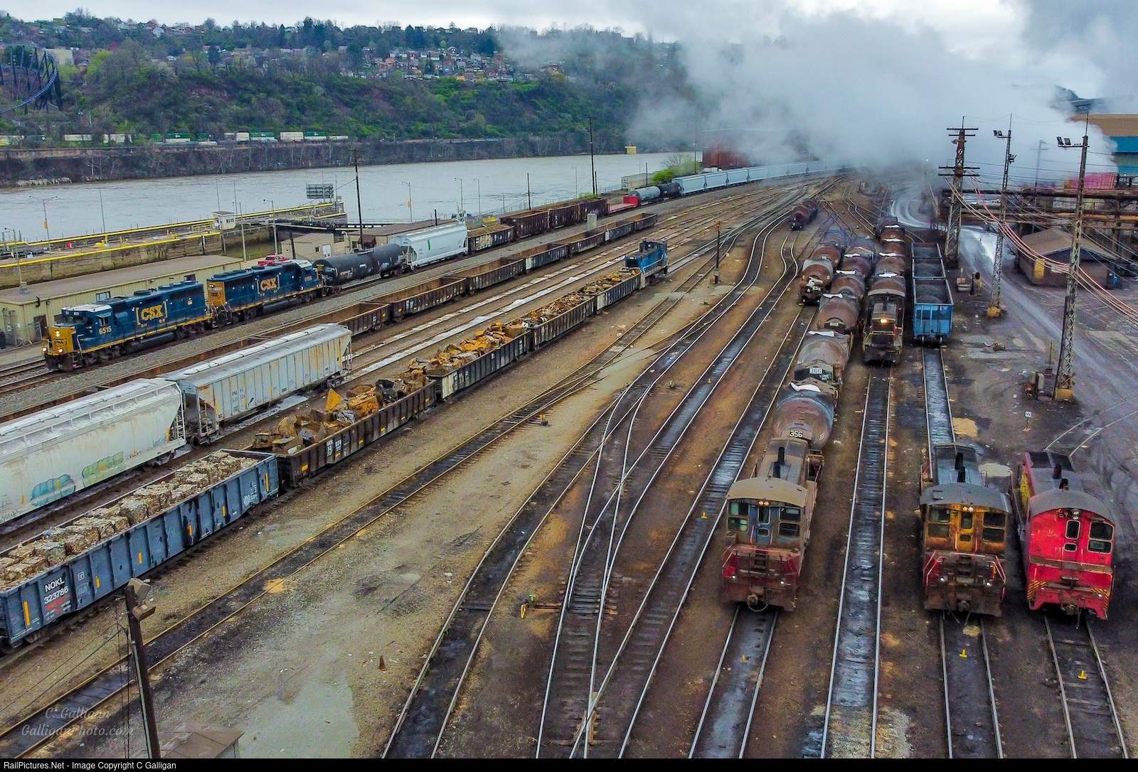 | Union Railroad 95A shoves scrap cars into the yard at Edgar Thompson Works while a line of Union Railroad locomotives complete various tasks, including shoving molten steel pig cars around. In the background, a CSX local is headed back to Riverton yard. |