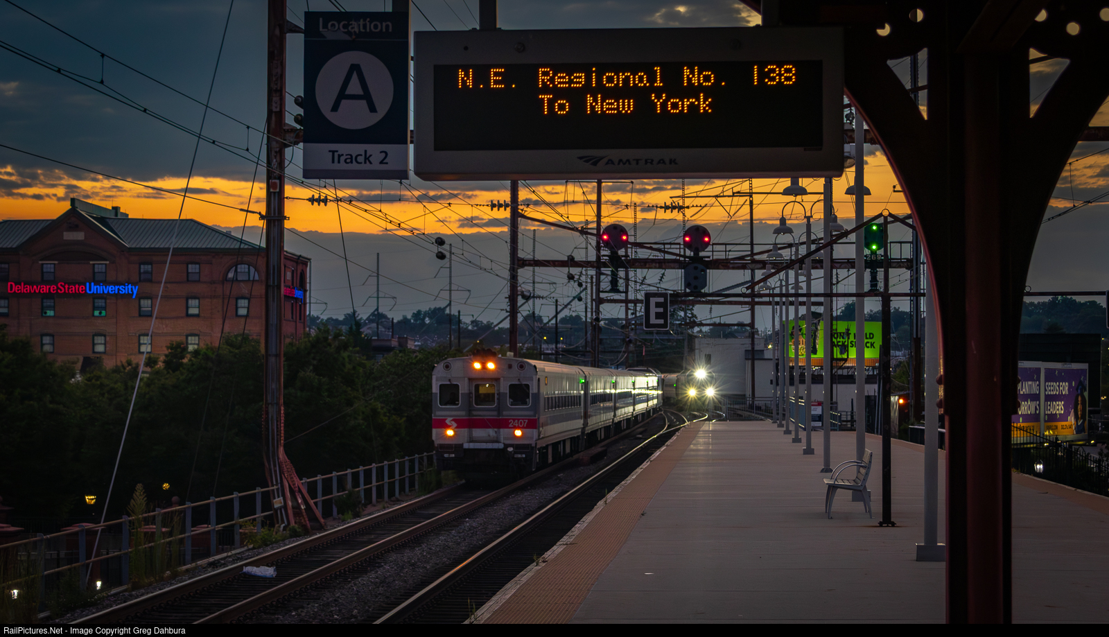 Amtrak 138 passes a SEPTA train on a busy evening at the Wilmington Amtrak Station with a nice sunset in the background.