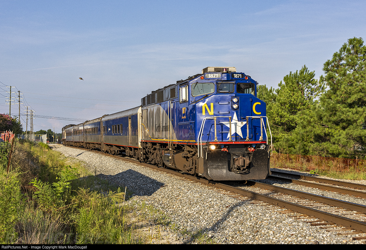 | An NCDOT equipment set pinch hits on Amtrak Carolinian train 79 as they depart Raleigh in the late afternoon. Due to a derailment on the CSX A Line, 79 originated in Raleigh with this equipment set instead of the usual Amfleet and P42 consist from the northeast. |