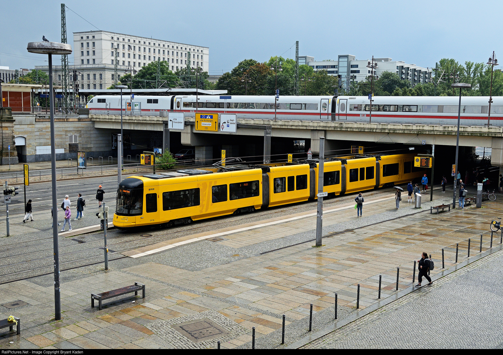 After some afternoon rain showers have subsided at Dresden Hauptbahnhof, a tram stops on the lower level as an ICE train crosses above.
