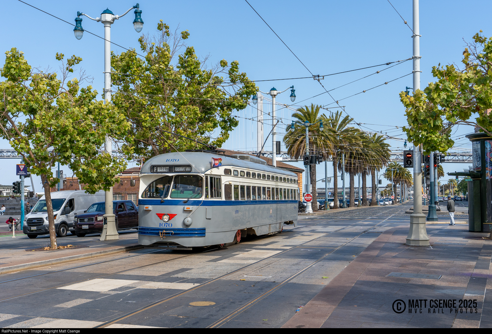 San Francisco Municipal Railway (MUNI) PCC car 1070 is seen on Market St operating F Market & Wharves service. The car was built by the St. Louis Car Co. in 1946 as Twin City Rapid Transit Co. car 333. Only a few years later, this car (and others) was sold to Public Service Coordinated Transport for service in and around Newark, NJ, and fittingly this is the livery the car sports in San Francisco today! |