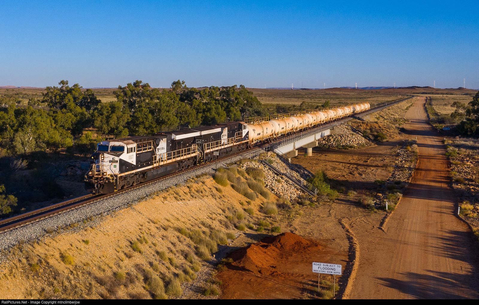 One of the only non-iron ore trains that runs in the Pilbara is the fuel trains used to deliver fuel to the mines from Port Hedlund. With a pair of ES44ACi's leading the way, Roy Hill's empty fuel train heads north over the bridge at Coonare Creek, Western Australia as it makes an evening run returning from the mine.