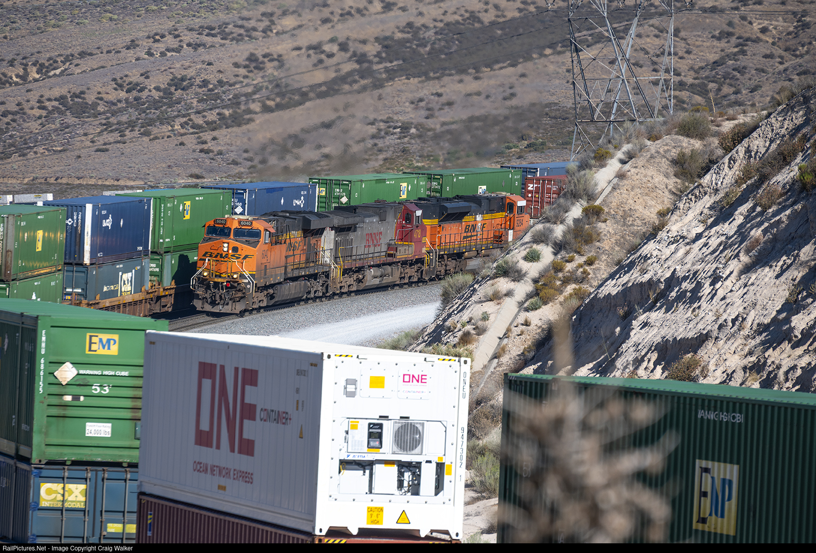 Two intermodal trains are climbing toward Cajon Summit, but the BNSF train, Q-LACNWH6-19L, which appeared in the distance first, was quickly overtaken by Union Pacific Long Beach to Denver train Z-LBDV-19 (symbolled F-ZLBDV01-19Z on the BNSF, on whose trackage this is), which arrived at Summit first on Main 2. And, no wonder, as the BNSF computer lists it as only 10 cars in length! UP AC4400CW 5741 leads this train, along with AC4400CWs 6035, 5587, 6873 and ES44AC 7404 … 22,000 horsepower for just 10 cars.