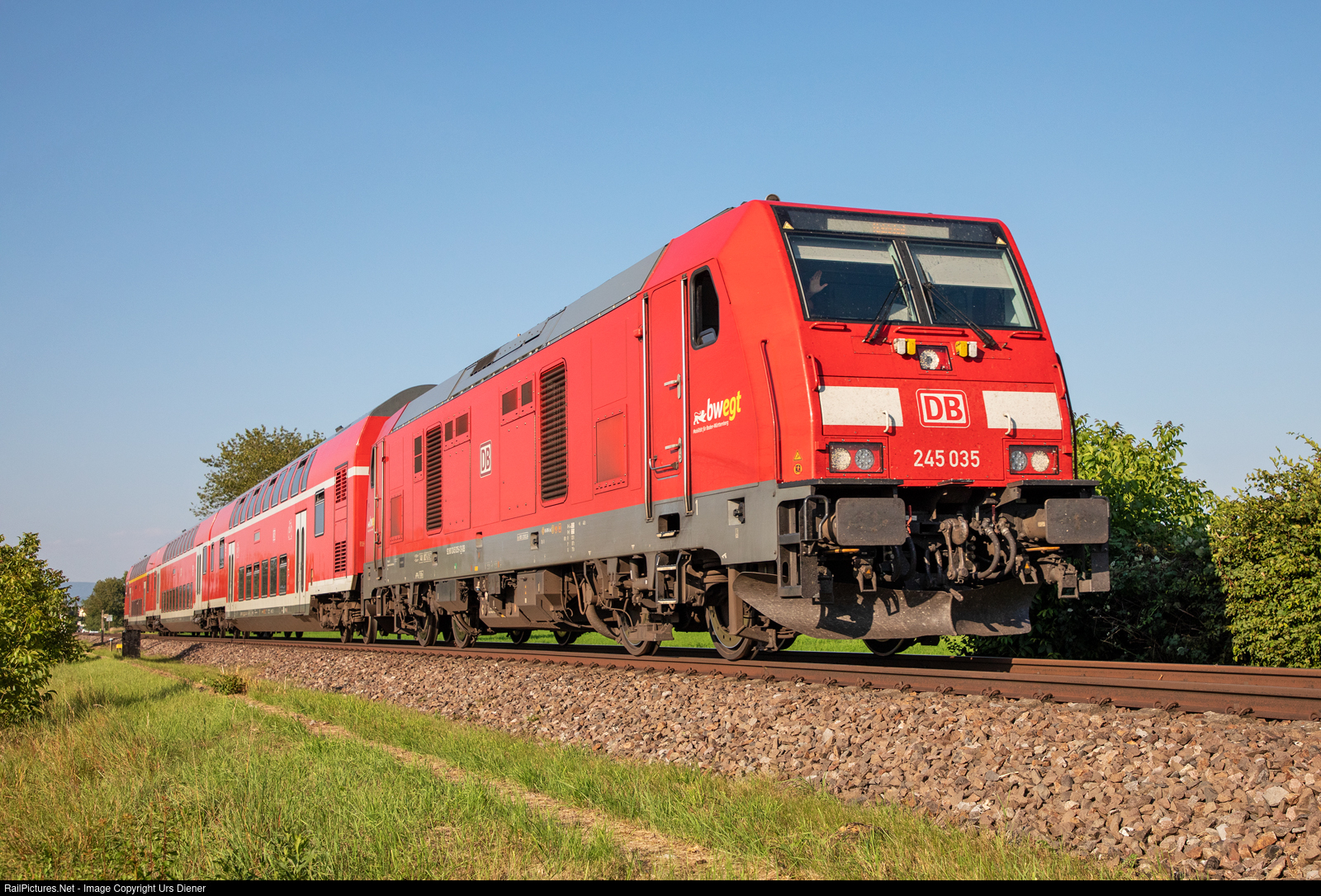 | The Bombardier TRAXX P160 DE ME diesel locomotive with the number 245 035, manufactured by Bombardier in Kassel in 2017, is on the way from Friedrichshafen Stadt to Basel Bad Bf with a push-pull train consisting of three doubledeck cars. |