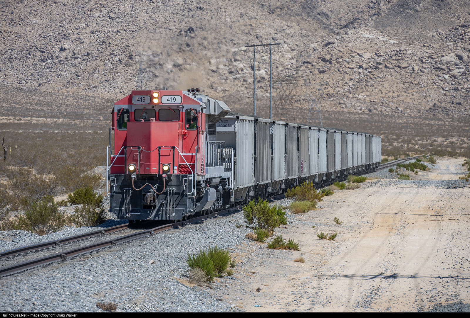 With Quartzite Mountain as a backdrop, Mojave Northern SE32C diesel 419 brings a nineteen-car string of 3-bay hopper cars (built by Freight Car America) from the Black Mountain Quarry to the plant in Victorville. The train’s destination is within a couple of miles here in northern Victorville.