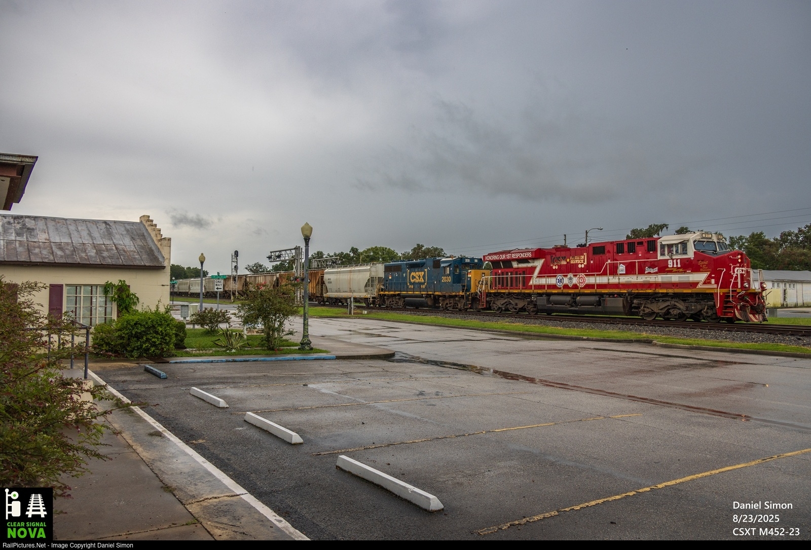 CSX ES44AH #911 leads train M452 north up the old Seaboard Air Line main through Bushnell, Florida this afternoon. Engine 911, which pays homage to first responders, provided plenty of color to a scene in the sunshine state with not so much sunshine