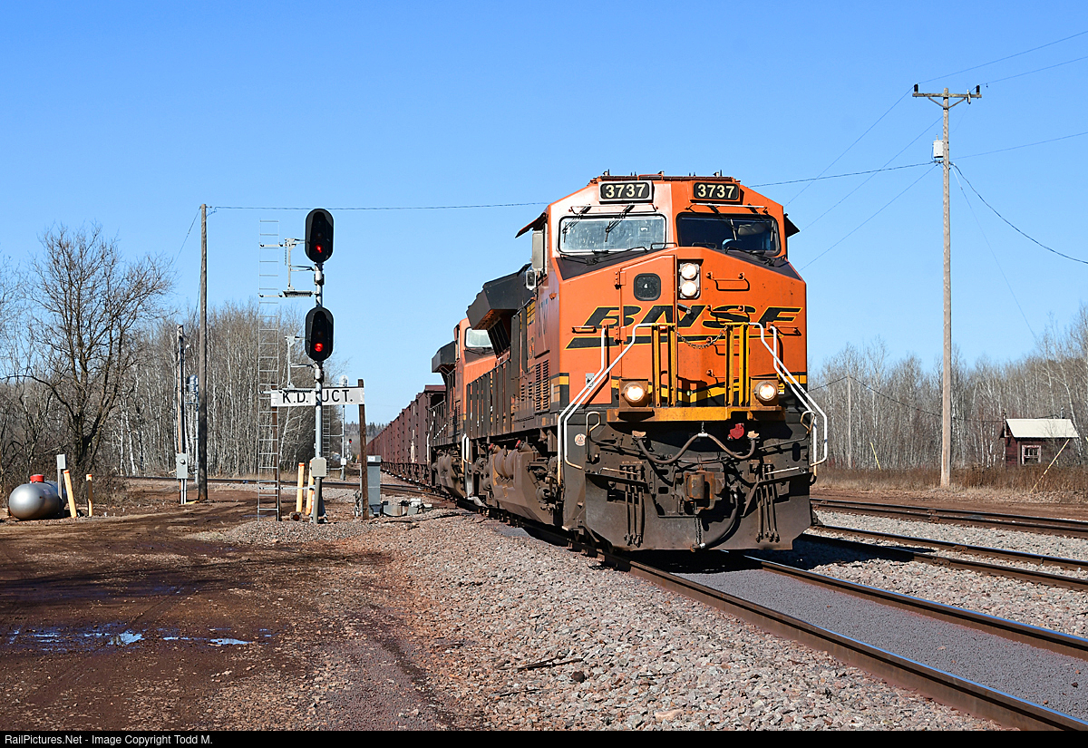 | After loading and then shoving from Keewatin Taconite back to Kelly Lake, BNSF 3737 is ready to depart the yard and head down to BNSF's ore dock facility at Allouez, WI. |