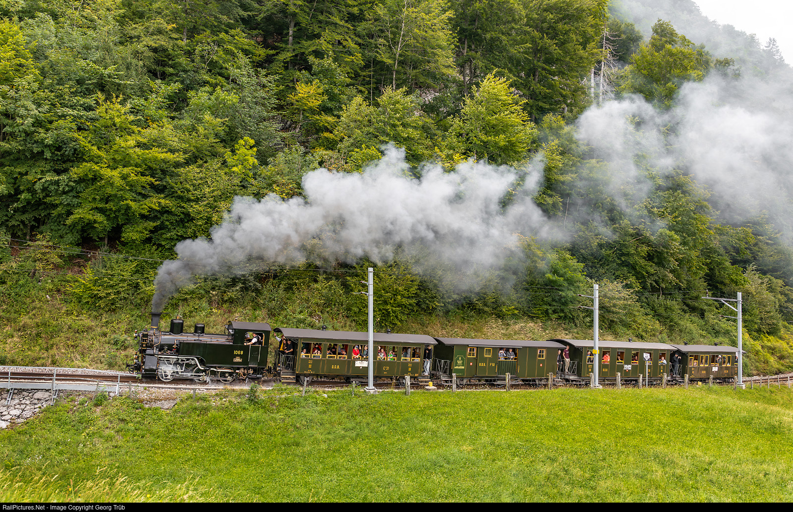 | To mark the 20th anniversary of Zentralbahn, a merger of the SBB Brünig line (meter gauge) and the Lucerne-Stans-Engelberg Railway (LSE), steam trains of the Brünig Dampfbahn (BDB) circulated between Meiringen and Brienz (loc G 3/4 # 208) and Meiringen and Brünig-Hasliberg (HG 3/3 # 1068). Train 30011 from Meiringen to Brünig-Hasliberg with cogwheel steamlocomotive HG 3/3 # 1068 (built 1926) is tackling the 11 % grade below Brünig pass. |