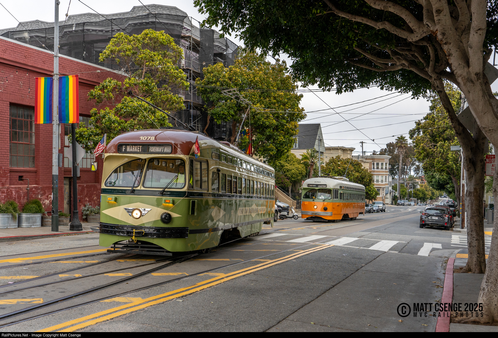 San Francisco Municipal Railway (Muni) PCC cars 1078 and 1080 are seen at 17th & Castro, awaiting their turns to reenter service on the F Market & Wharves Line. |