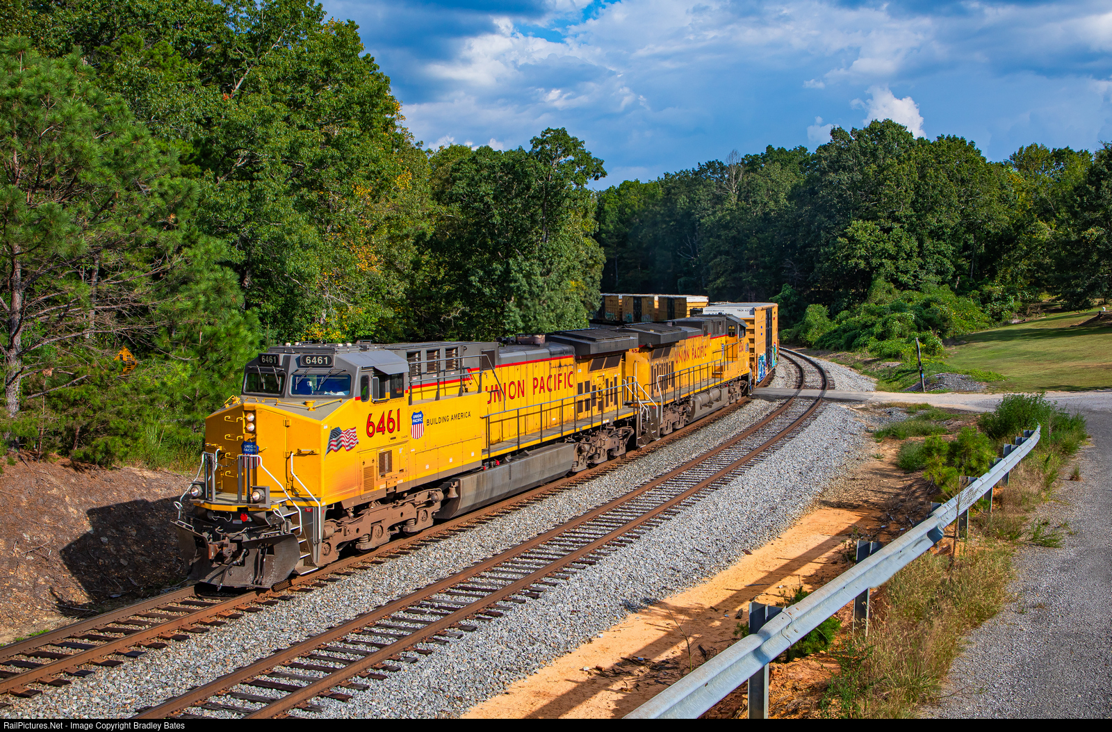 | A pair of Union Pacific GE locomotives lead Norfolk Southern train A79 west as they sweep around the curve at CP Bankhead just outside of Lynn, AL. |