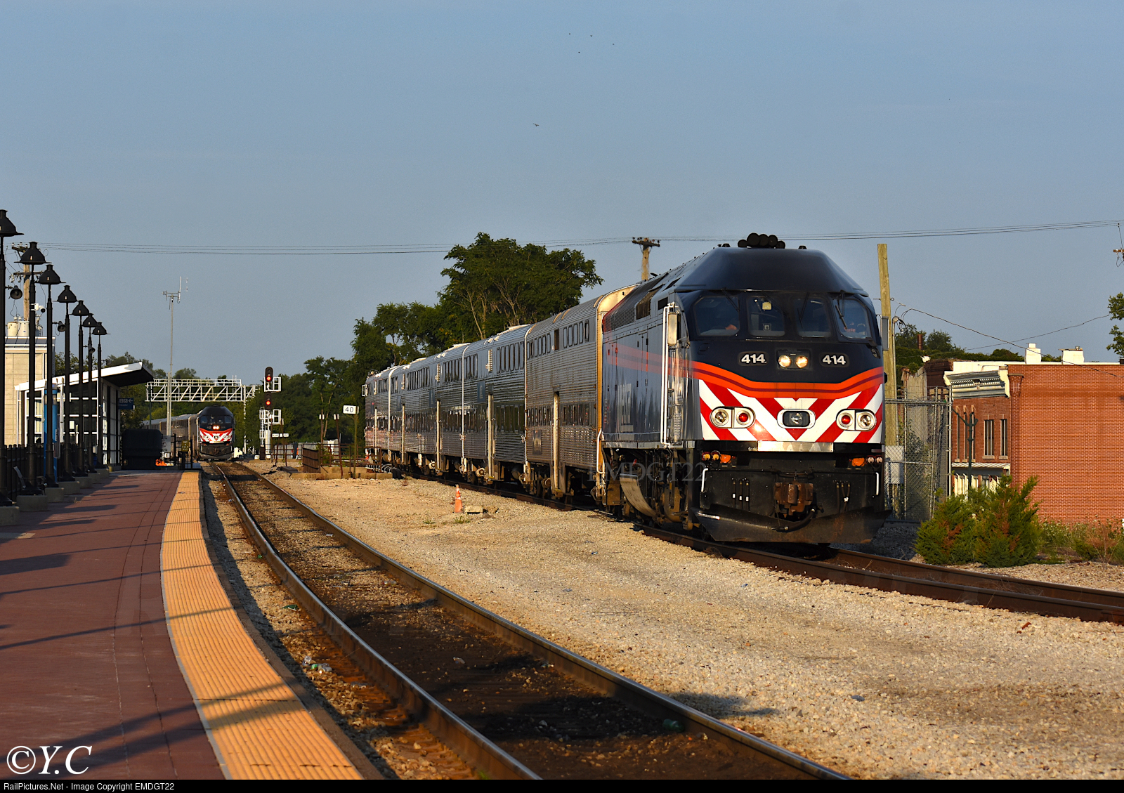 Two Metra trains meet at Joliet Union Station. The train on the left had just finished unloading passengers and is heading east to Chicago. The train on the right just came off the Rock Island District and is reversing towards the yard.