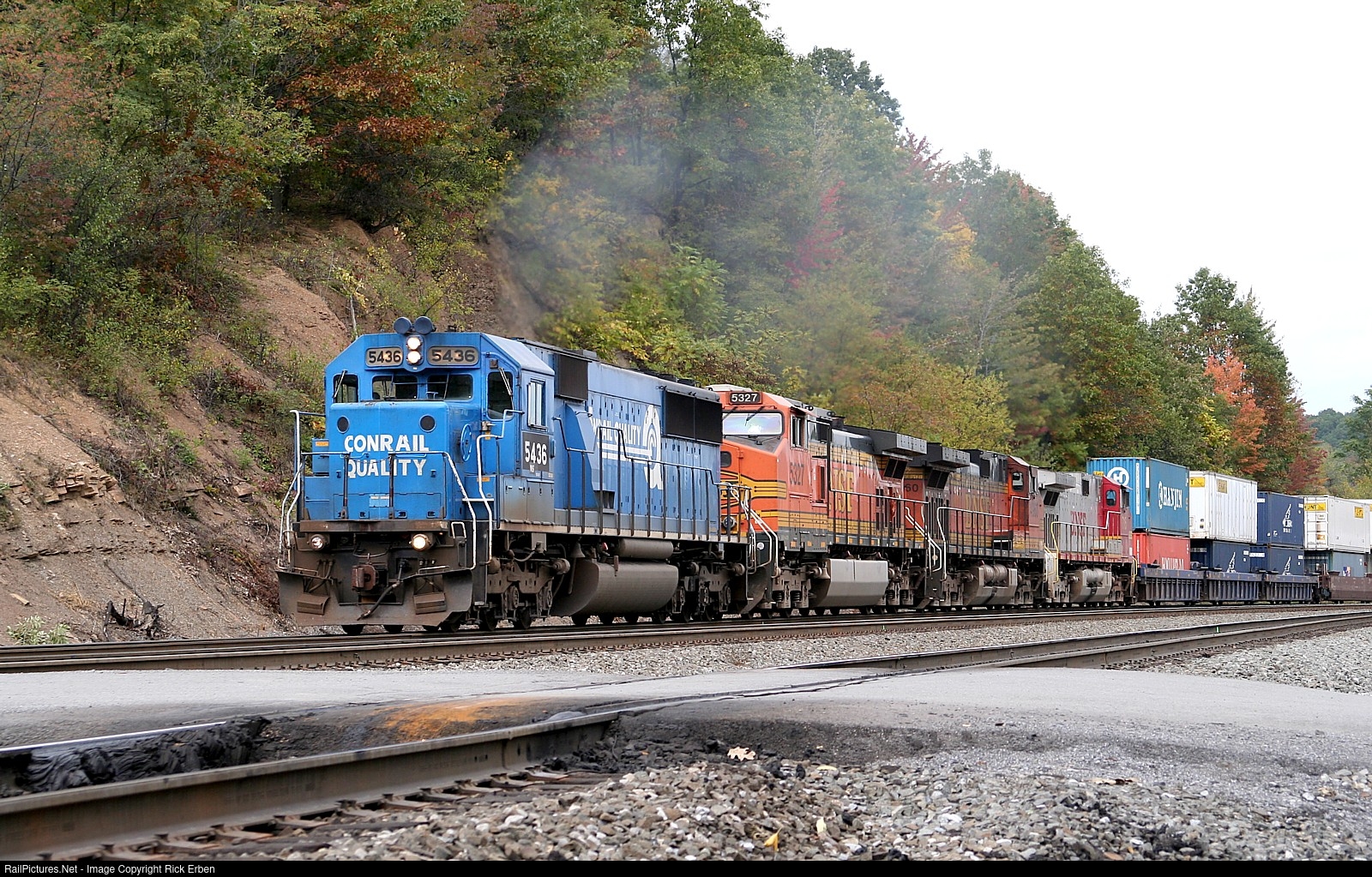 | NS 5436, former Conrail SD50 No. 6766, leads a trio of BNSF Dash9s on a westbound intermodal at the Brickyard crossing on an early October afternoon. |