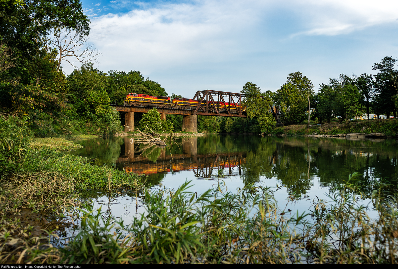 | A trio of KCS "Southern Belle" locomotives lead a northbound train of autoracks across the Illinois River bridge just north of Watts, OK on the mostly sunny afternoon of Sunday, August 24, 2025.