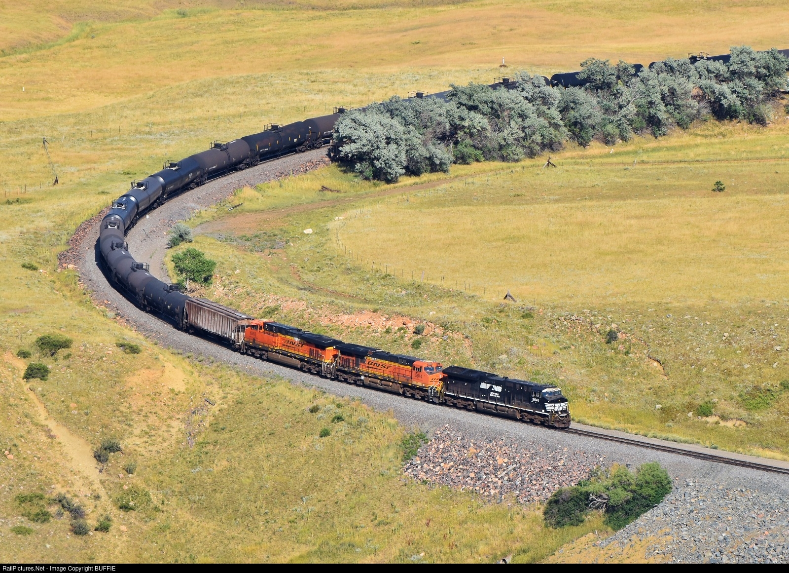 Norfolk Southern 3641 (ET44AC) leads an oil train around a wind break made up of loaded gravel hoppers which have been welded to the tracks at the Big Ten Curve in Rocky, Colorado.