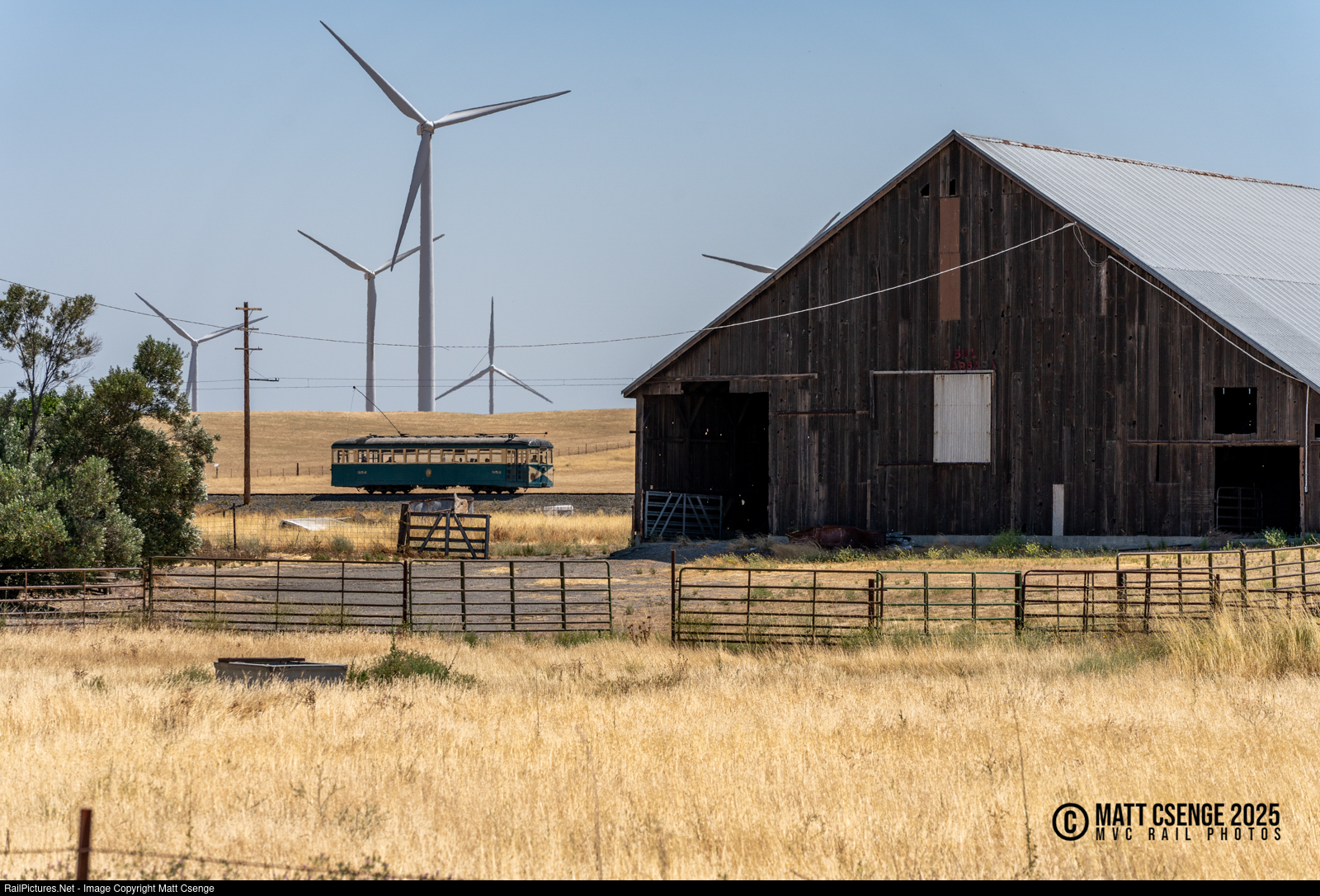 Anachronism. East Bay Street Railway car 352 is seen trundling across the rural Northern California landscape at the Western Railway Museum, making a run down to Birds Landing. East of the line is a large wind farm, which stands out in contrast to the transit equipment and structures from the century prior.