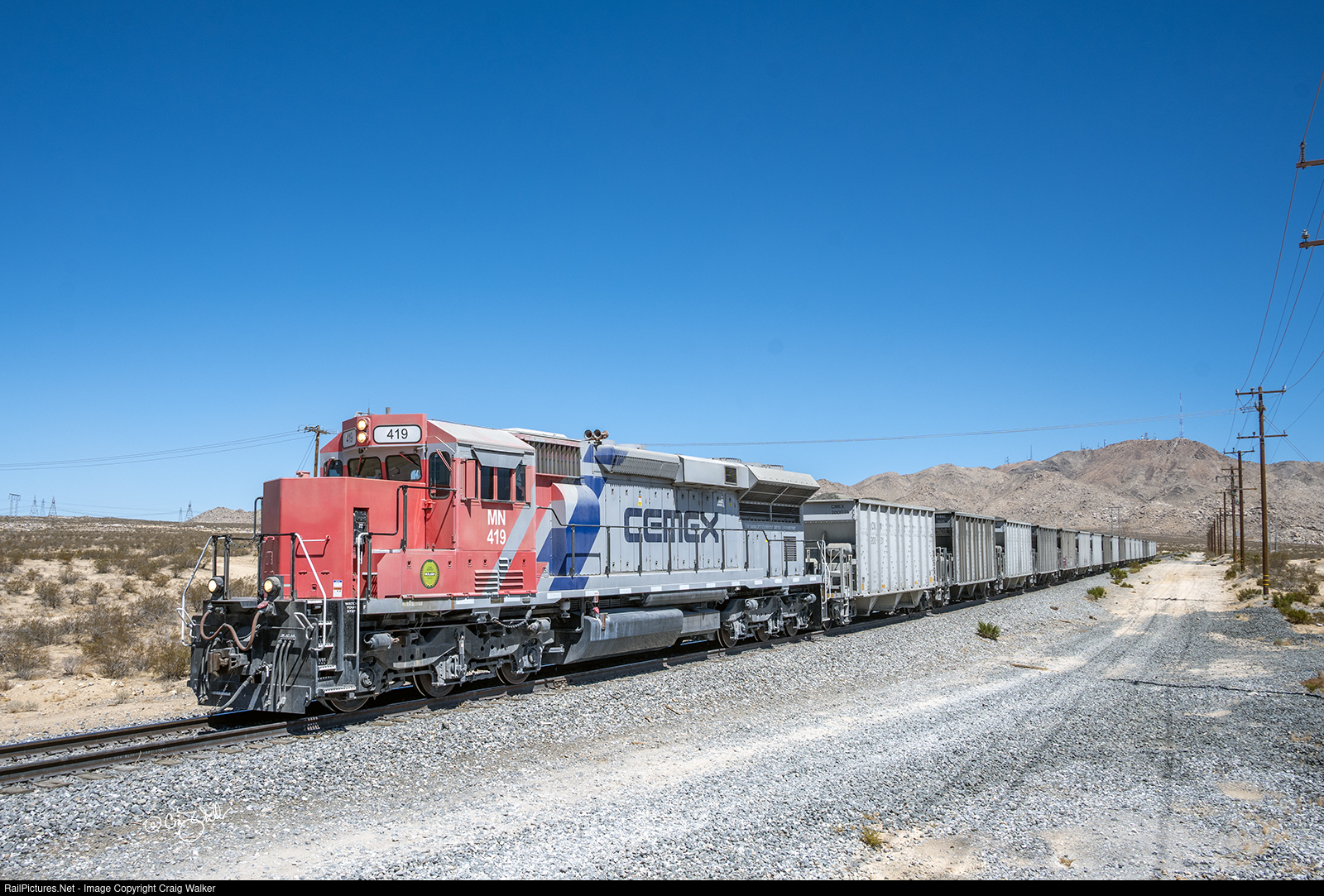 Mojave Northern SE32C diesel 419 brings a nineteen-car string of 3-bay hopper cars (built by Freight Car America) from the Black Mountain Quarry to the Victorville Cement Plant, about mile ahead.