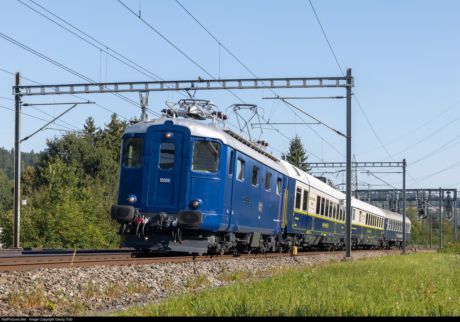 Special train organized by the travel agency ZRT Reisen through the Jura, with former SBB locomotive Re 4/4 I # 10009 (privately owned, Classic Rail), two cars from the PRESTIGE CONTINENTAL EXPRESS, and one car from the SUISSE TRAIN BLEU, as train 31035 between Winterthur and Tössmühle. On the first day, the journey took the train from Winterthur via Wallisellen-Zurich-Brugg-Olten-Solothurn-Biel-Sonceboz-Sombeval-Moutier-Delémont to Porrentruy and back to Delémont. The locomotive was in service for the SBB in this blue color between 1958 and 1959 as Re 4/4 I # 409 and was repainted in the same color in 2025.