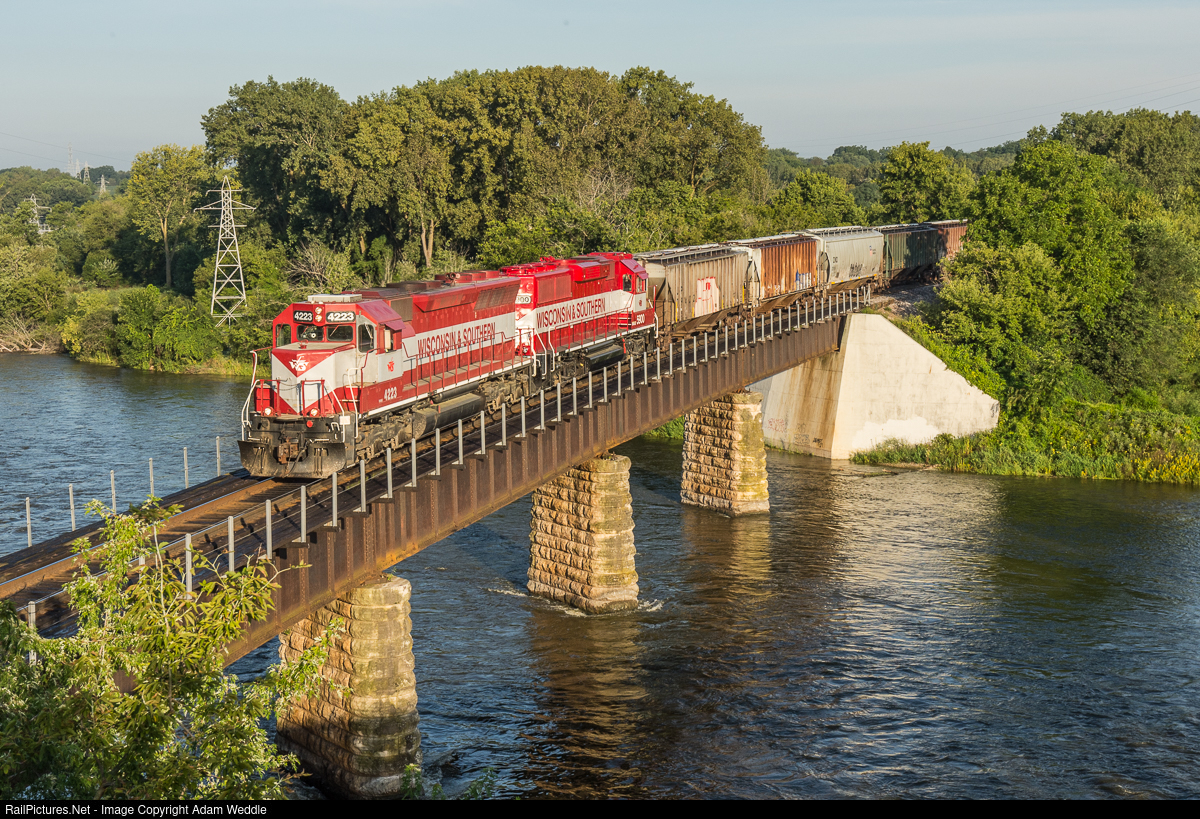 | With the dynamic brakes whining, Y302 eases out of the WSOR Janesville Yard, and over the Rock River on the Fox Lake Sub. They're heading to Wheeler Pit to stage Chicago bound traffic for pick up by the T004 later in the day. |