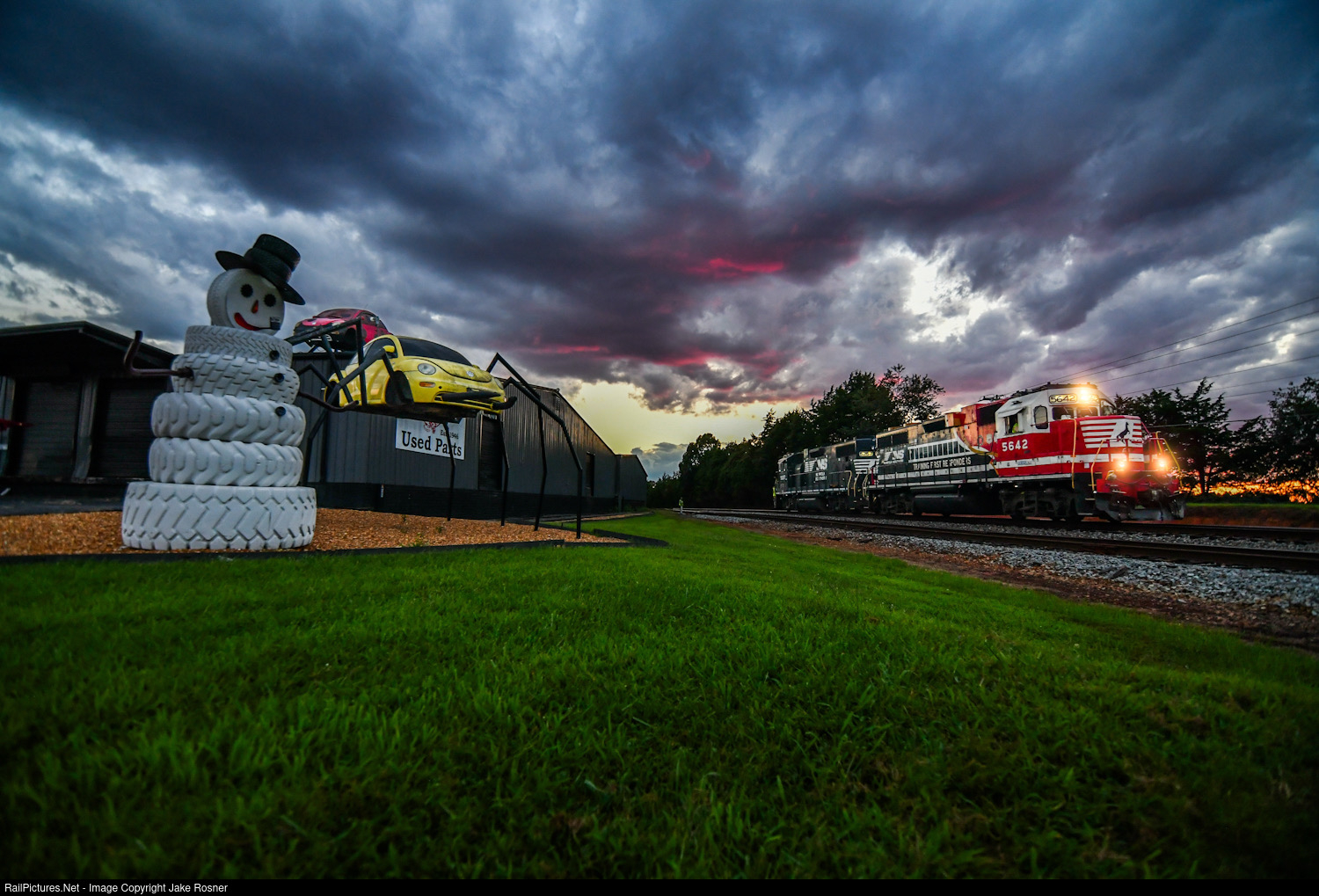 | With the setting sun casting a pink glow on the clouds above, NS P95 makes runs around its train at Claremont to work the industrial park. NS 5642 leads the way, passing by some crazy builds from the auto shop on the left side of the screen. |