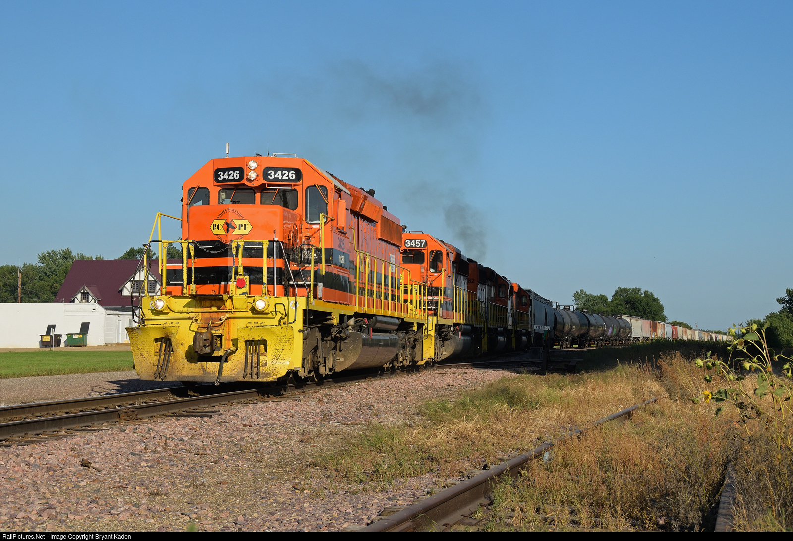 After stopping briefly to normalize the west siding switch at Tracy, a westbound Rapid City, Pierre & Eastern train is getting underway again. The yard tracks on the right are being overgrown by sunflowers this year and haven't seen cars in a long time.
