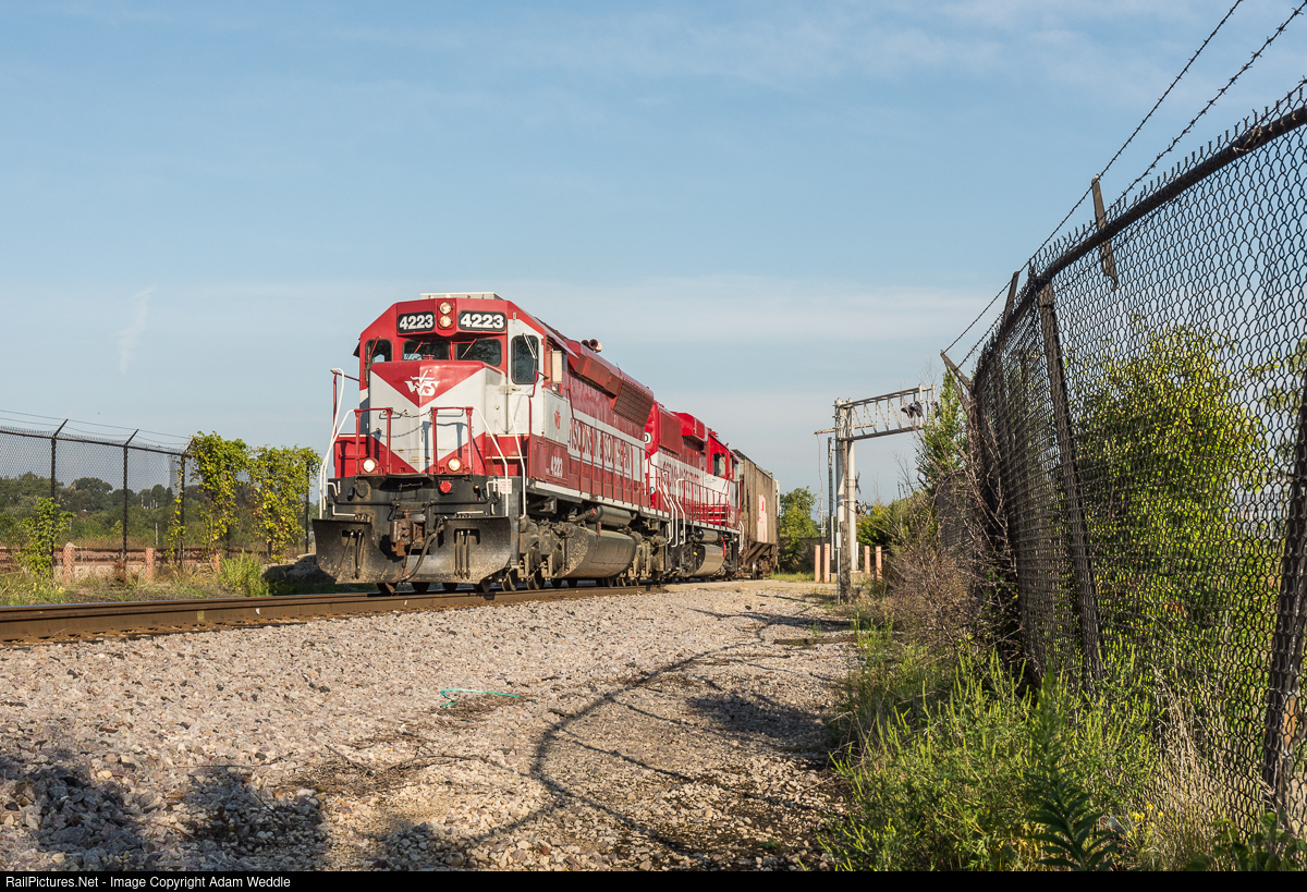 | WAMX 4223 leads Y302 around the S-curves at the former site of the Janesville General Motors plant. GM shut this plant down back in 2008, and the buildings were demolished several years ago. Now the area is many acres of vacant land, and the city is trying to figure out what the next use for that land will be. From a railroaders perspective, hopefully the the S-curves are eliminated and turned into one sweeping curve. The fencing and foliage combined with the curves create a lot of blind spots. Operating a 10,000 plus ton train at restricted speed through this area isn't exactly fun! |