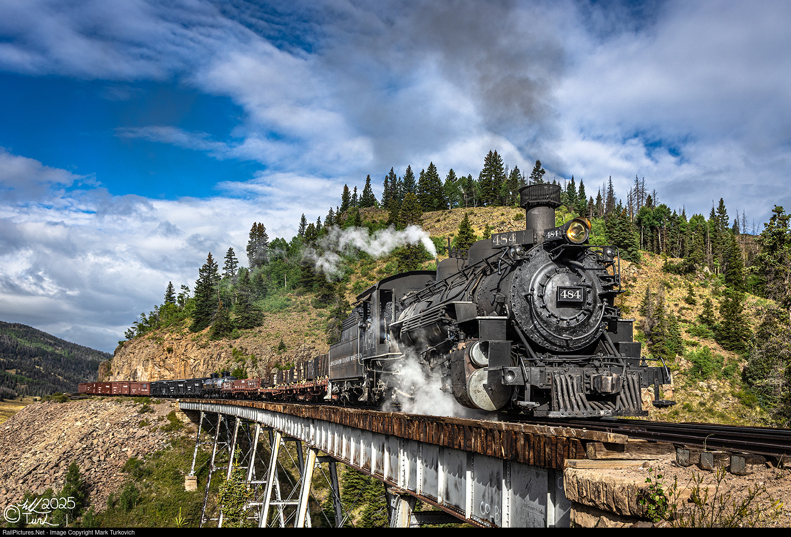 Denver & Rio Grande Western 484 leads its long freight train across Cascade Trestle on a cool August morning.