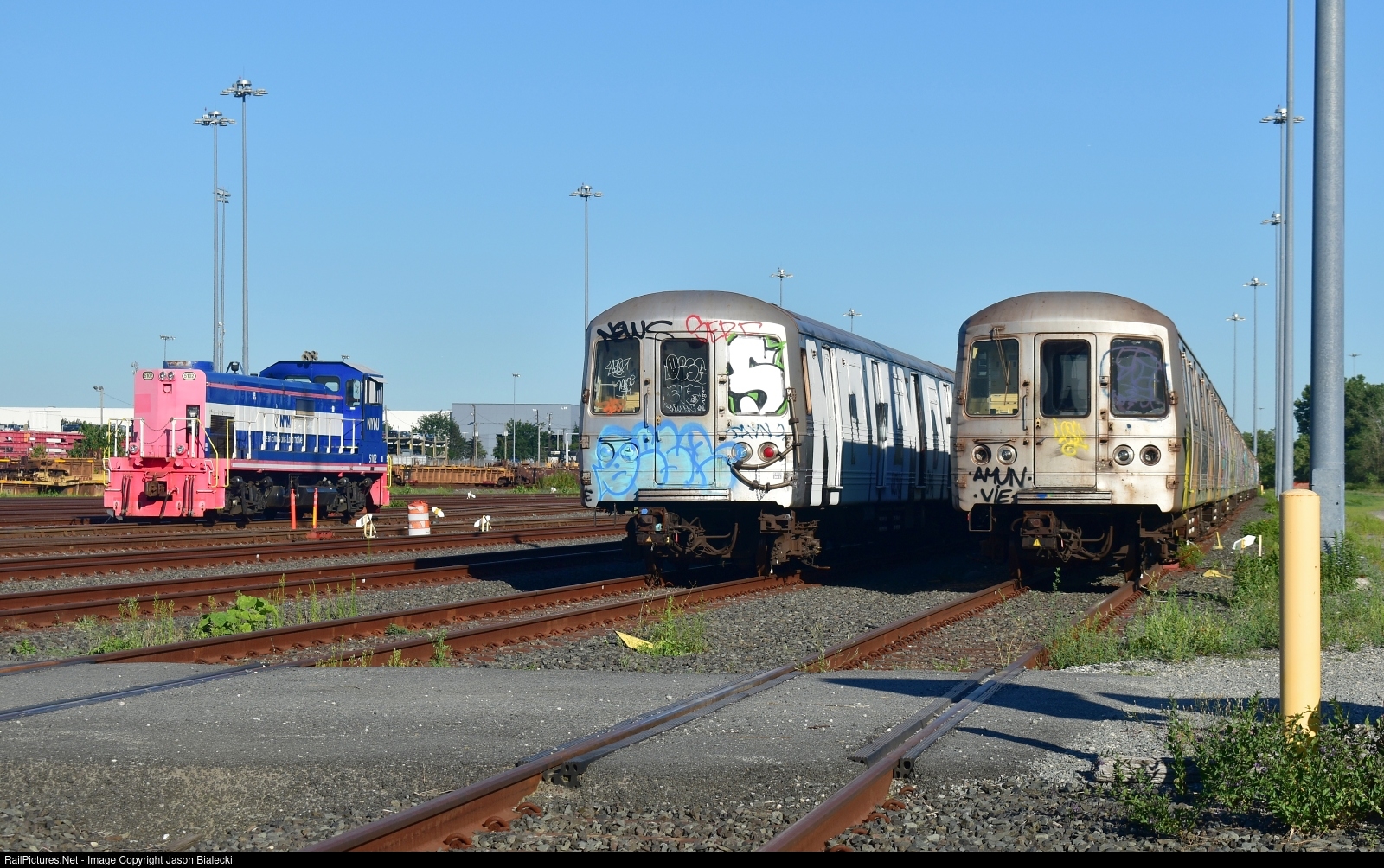 Subway Cars in Greenville Yard - The R46 is a New York City Subway car model that was built by the Pullman Standard Company between the years of 1975 - 1978. They were refurbished in 1990 - 1992 and were taken out of service in 2025 and slated for scrap. These R46s were first taken to the 65th Street Yard in Brooklyn and then ferried on a railcar float across the Upper New York Harbor to this location at Greenville Yard in NJ. NYNJ 5102 is also in view and is one of the main locomotives assigned to the New Jersey side of the NYNJ rail operations. Photo location accessed by kayak.