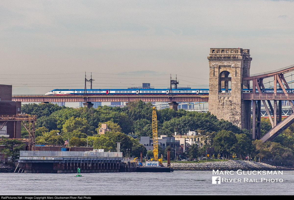 Acela 2, Day 1. On Thursday, August 28, 2025, Amtrak introduced the Alstom Acela 2 to the revenue riding public. The culmination of many years of work debuted on Train 2153 (TS 20/AMTK 2130-2135) and Train 2154 (TS 21 AMTK 2122-2129). For the moment, these two will cycle and return respectively as Trains 2170 and 2171 on weekdays. Amongst other things, the new Acela offers increased speeds and increased capacity, and their entry begins to signal the exit of the legacy Acelas. The train is seen crossing the Hell Gate Bridge.
