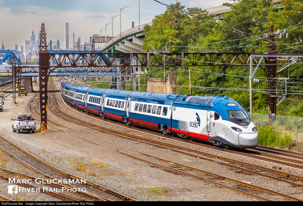 Acela 2, Day 1. On Thursday, August 28, 2025, Amtrak introduced the Alstom Acela 2 to the revenue riding public. The culmination of many years of work debuted on Train 2153 (TS 20/AMTK 2130-2135) and Train 2154 (TS 21 AMTK 2122-2129). For the moment, these two will cycle and return respectively as Trains 2170 and 2171 on weekdays. Amongst other things, the new Acela offers increased speeds and increased capacity, and their entry begins to signal the exit of the legacy Acelas. The train is seen in the Bronx, New York with the Manhattan skyline next to the Bruckner Expressway