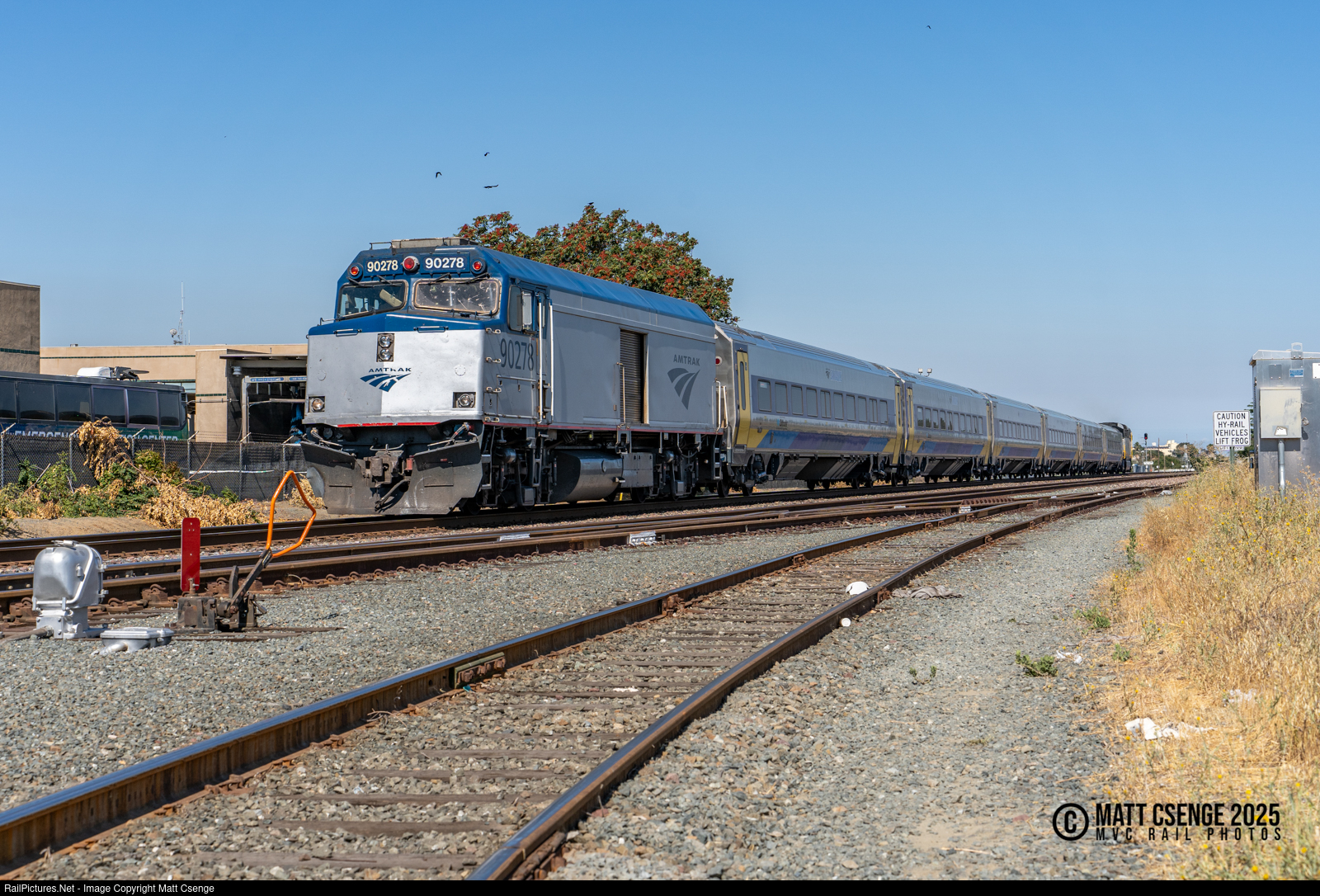 Amtrak F40 non-powered cab unit (NPCU) 90278 is seen leading San Joaquin train 710 through Antioch, en-route to Bakersfield. |