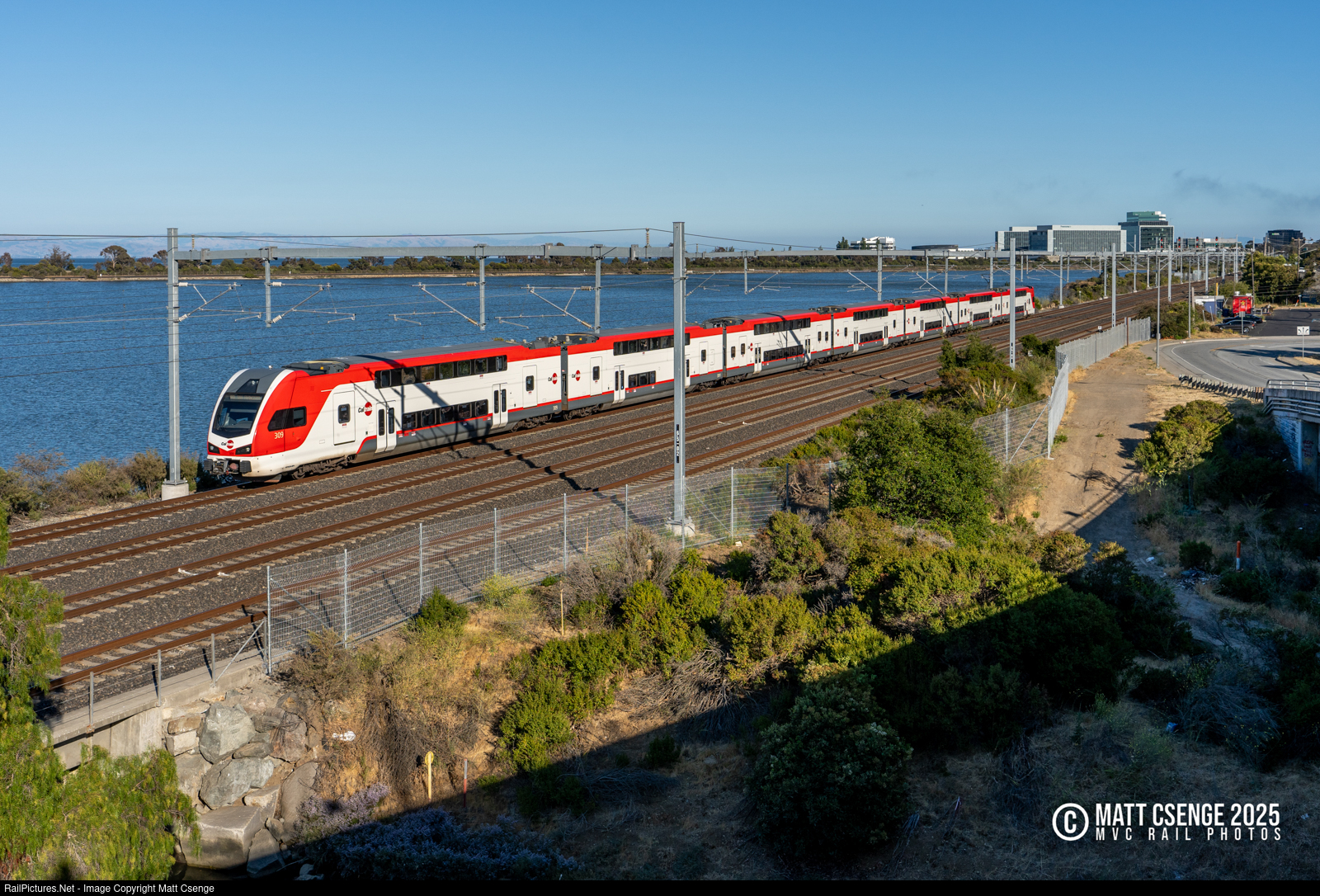 Caltrain Stadler KISS EMU no. 309 is seen gliding along the Brisbane Lagoon as it makes its way towards San Francisco as train 643.