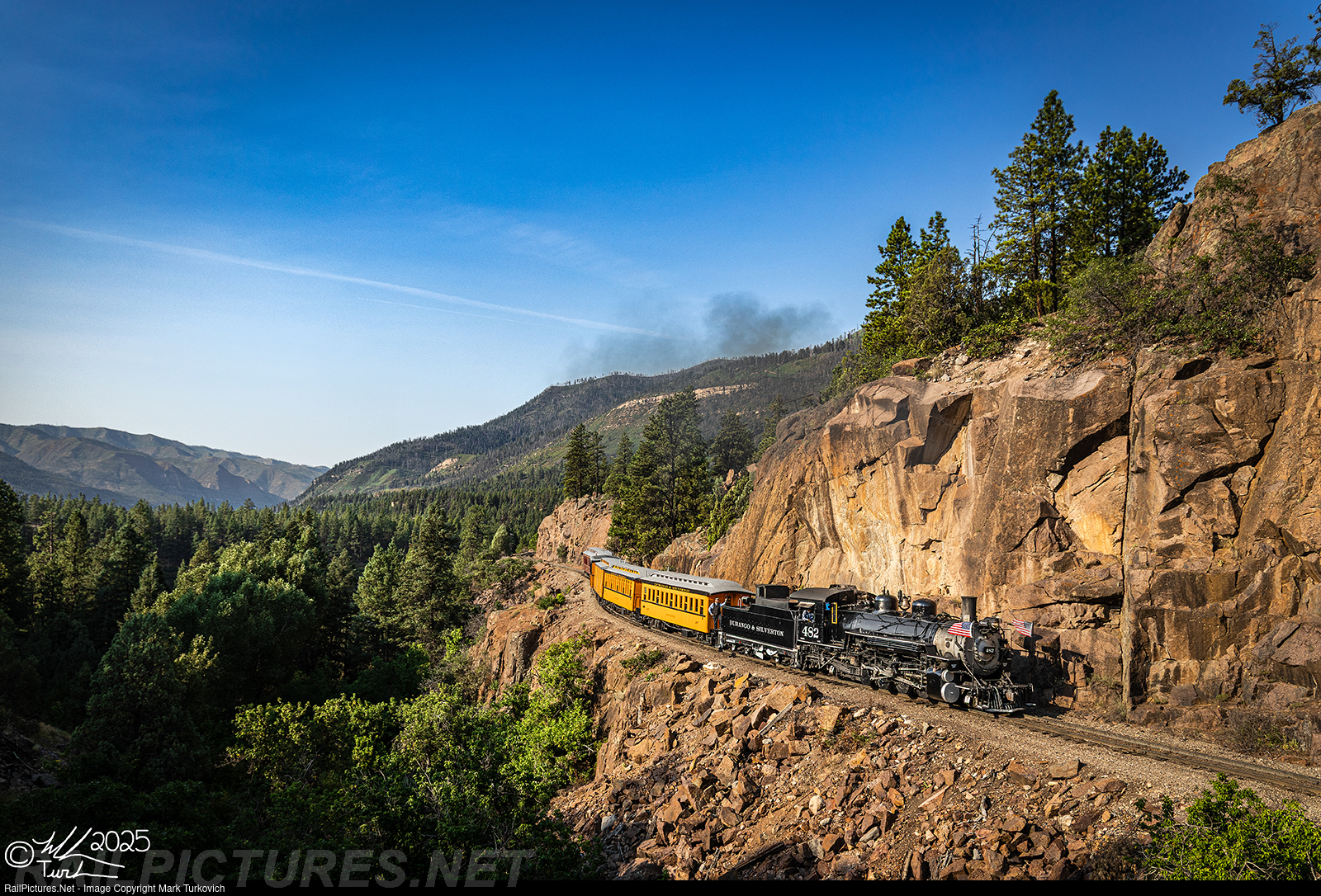 Durango & Silverton 482 leads a Presidential Special extra train along the ledge at Granite Point on a beautiful summer morning.