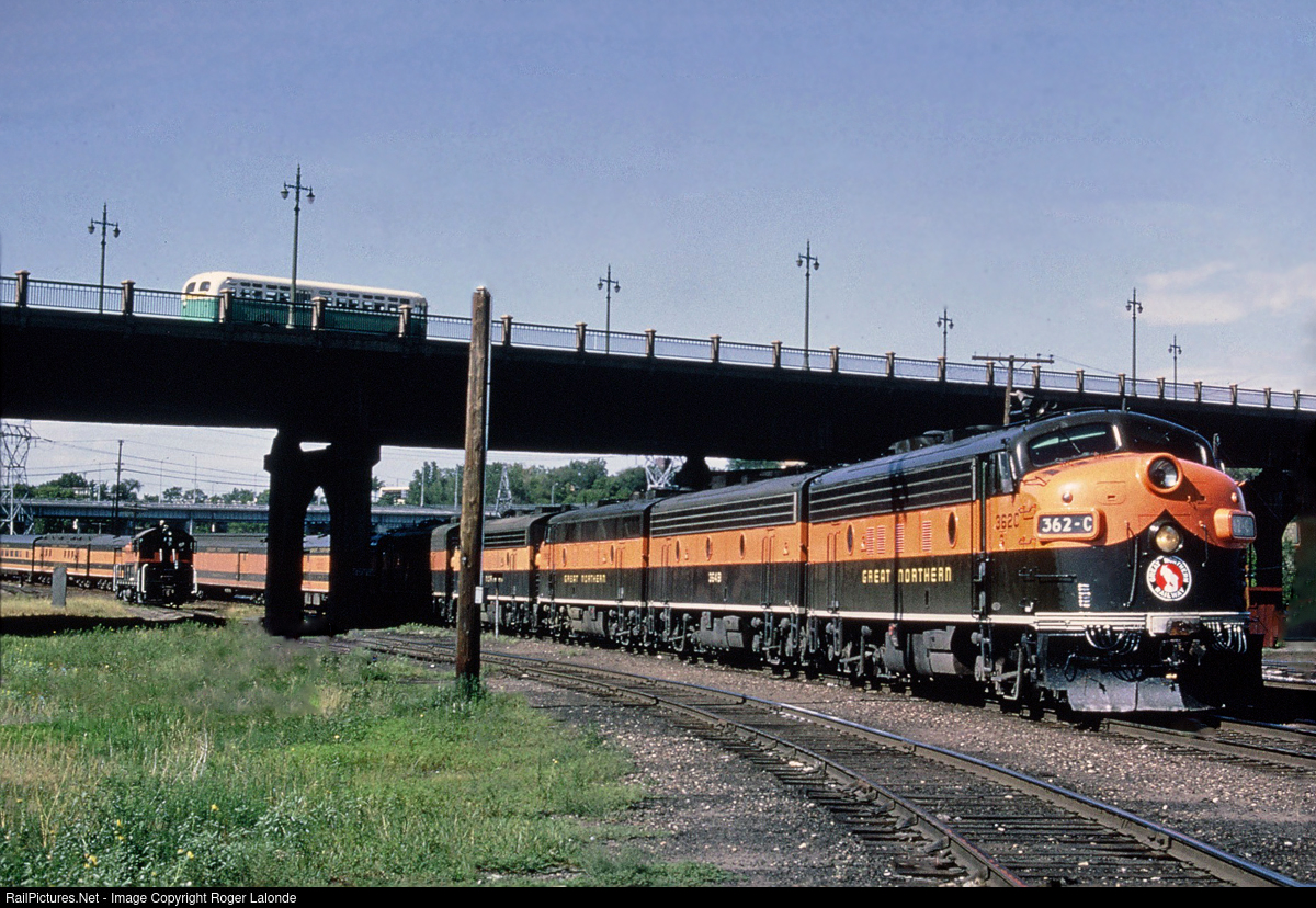Great Northern F7A 362C with F7B-F3A-F7A-F3A leads train 28 the "Western Star" arriving from Seattle, Washington in Saint Paul, Minnesota on July 25, 1964. At the Twin Cities the "Western Star" will continue to Chicago, with E-units of the Chicago, Burlington & Quincy Railroad. Photo by R.R. Wallin, from my collection
