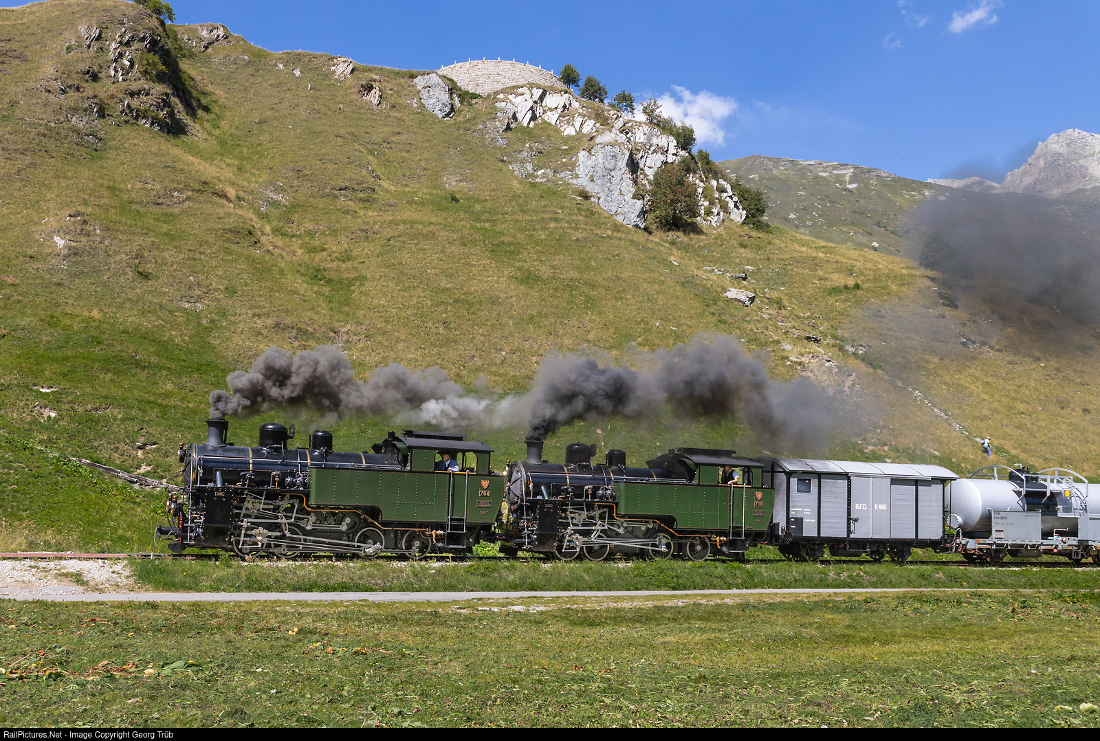 | Sister locomotives HG 4/4 # 704 and # 708 of the Dampfbahn Furka Bergstrecke, both built by SLM in 1923/1930 for french Indochina and brought back to Switzerland in 1990 more or less as scrap, pull a freight train through the gorge of the Furkareuss near Realp. # 708 is operational since the 2025 season. |