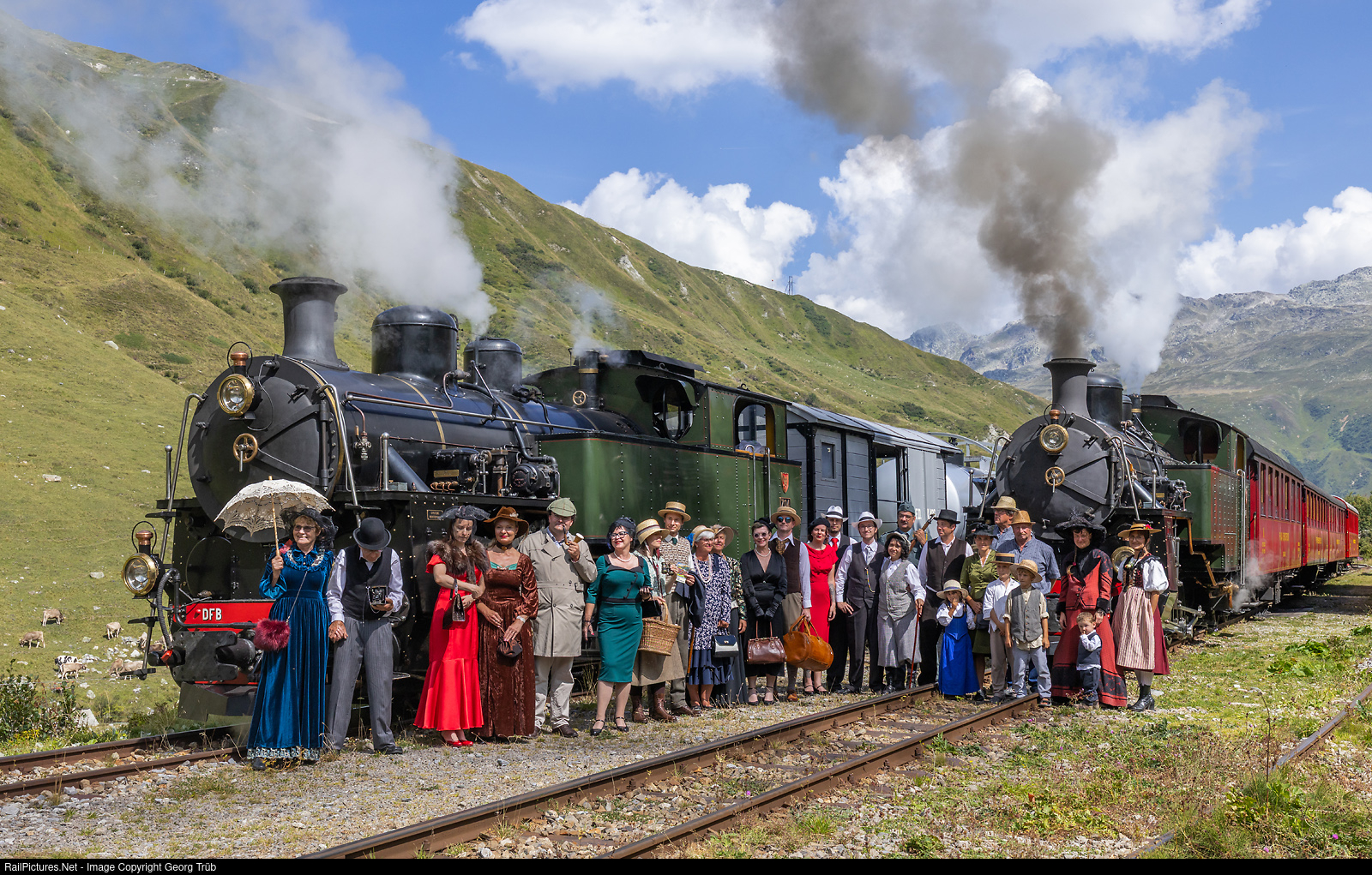 | Numerous travelers in period clothing enlivened the photo trip organized by P.M and the DFB at Furka, with two trains running from Realp to Furka DFB at 2160 meters above sea level. Here at a stop in Tiefenbach DFB with HG 4/4 # 704 in front of the freight train and HG 4/4 # 708 with the passenger train. |