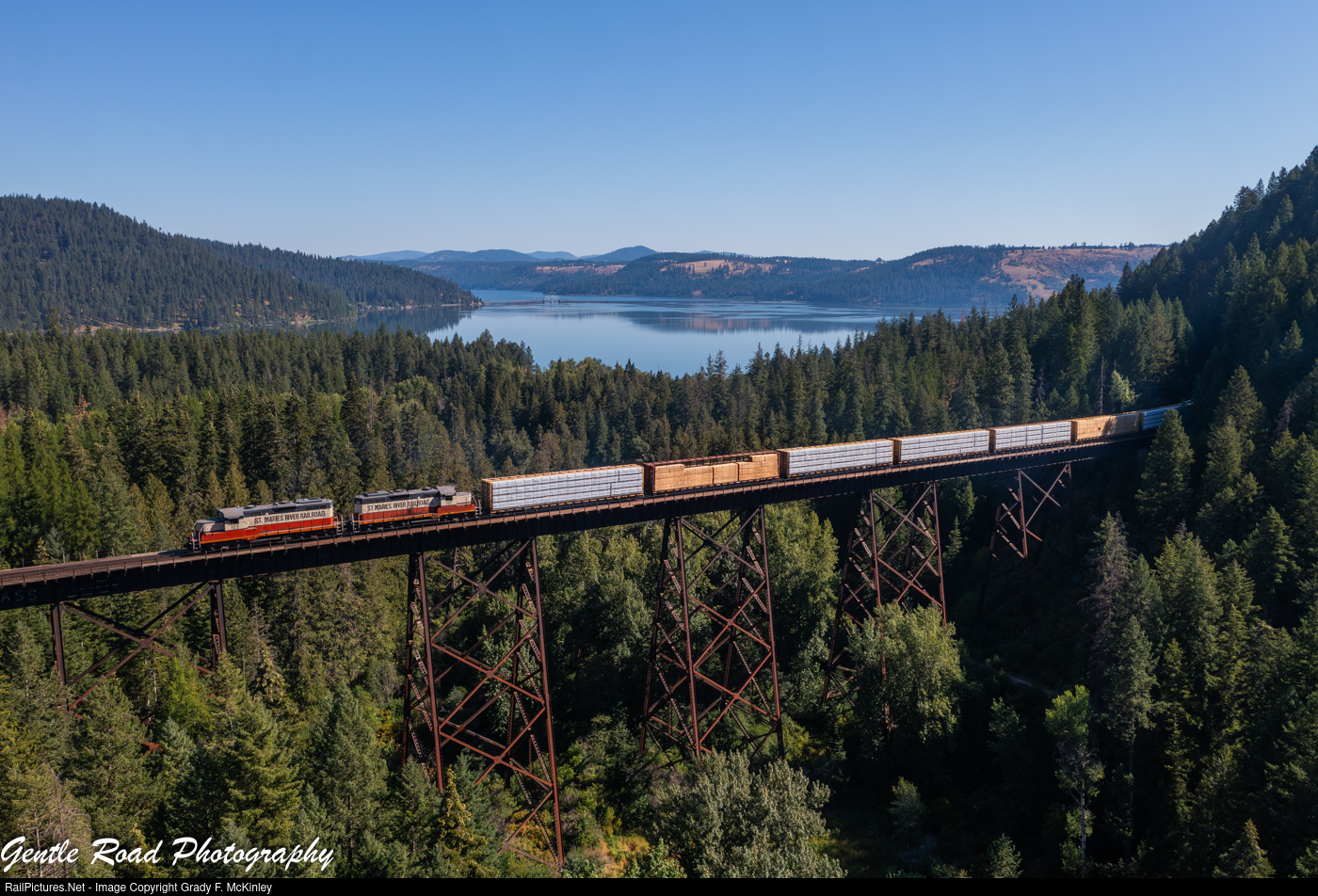 Former Milwaukee Road GP-9 #322 looks right at home crossing the massive Pedee trestle west of Saint Maries Idaho. In the distance is Chatcolet Lake and a keen eye can make out the abandoned Union Pacific trestle which now hosts the "Trail of the Coeur d'Alenes"